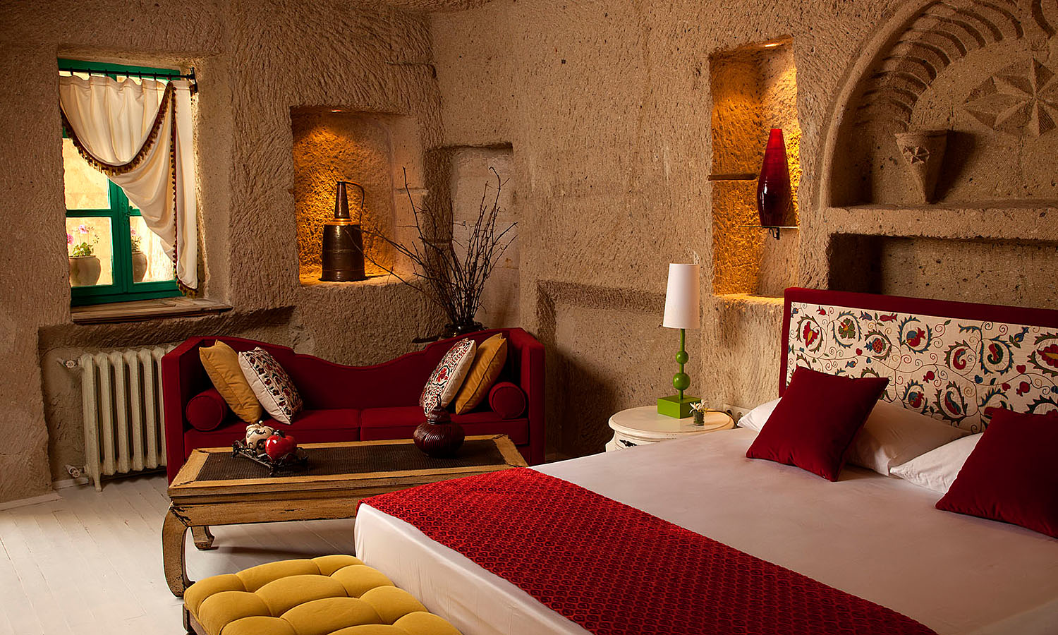 You know a cave hotel is the real deal when you wake to find ceiling rock crumbling over the bed. Hezen’s elegant rooms have been fashioned out of the ancient caves that pockmark Cappadocia, and you can still very much feel the rocky atmosphere.
