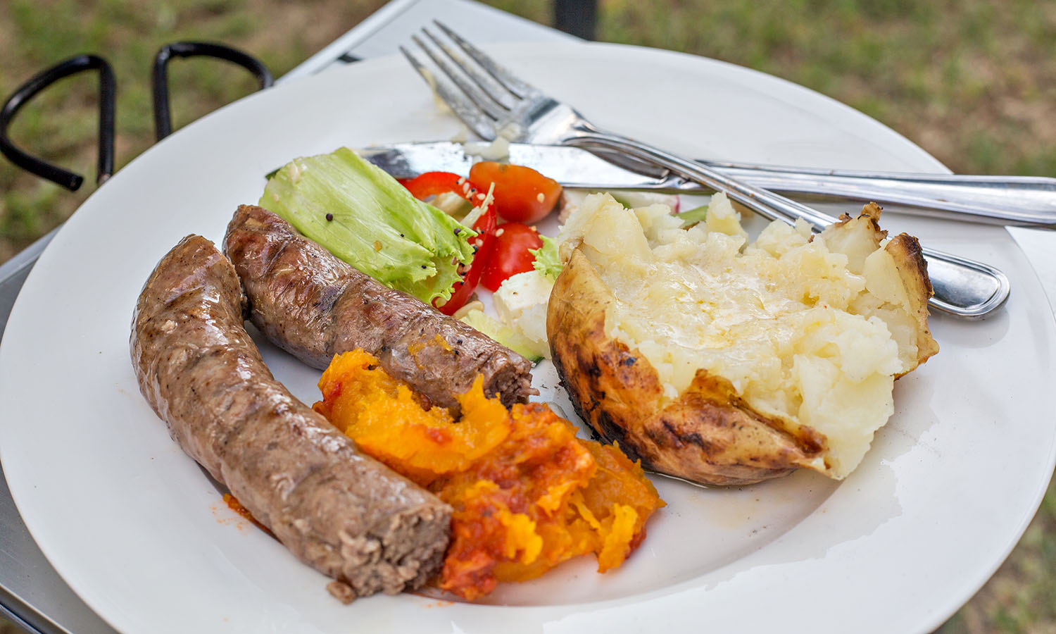 Potatoes baking inside a blanket of foil rest on the coals while appetisers are spread on an adjacent table. Sides of coleslaw, garlic bread and warm butternut pumpkin salad baked with cream and chakalaka, a much-loved local vegetable relish, are brought out to complete the meal. In northern provinces, they might also prepare pap – a maize porridge that can be eaten dry and crumbling or dampened with rich gravy.