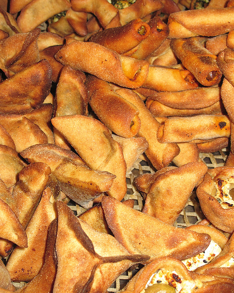 Roll the dough thinly and cut in circles around 10 centimetres in diameter. Check the filling to make sure it isn’t watery (you can squeeze out any excess moisture with your hands). Place a tablespoon of the filling in the centre of each circle of dough. Fold the dough in from three edges to form a triangle, and pinch to seal. Put each fatayer on a lined baking tray and cook in the oven until golden. Leave to cool and serve cold.