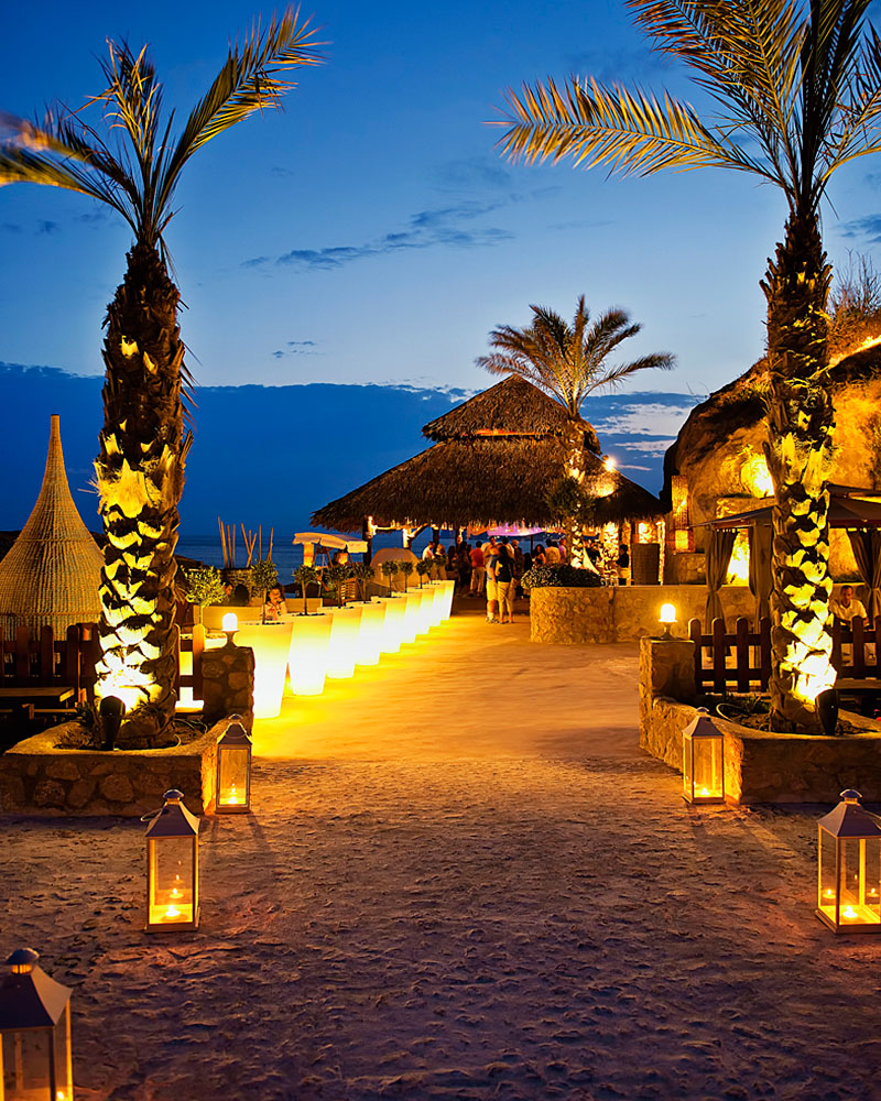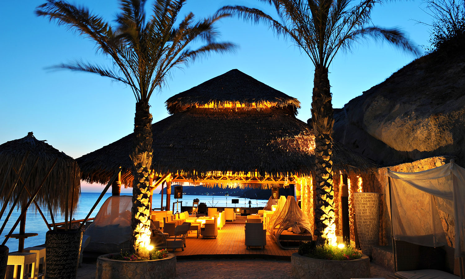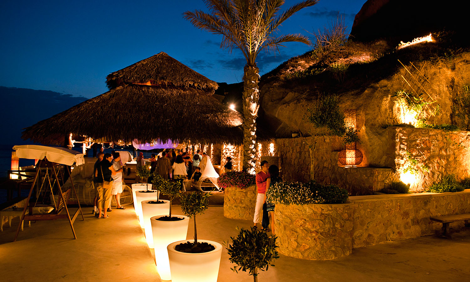This is an all-day affair, with lounges along a private beach servicing sun seekers. Take a dip in the sheltered bay or organise a massage between cocktails. There’s a casual-chic restaurant and bar area overlooking the sea that, at night, is beautifully lit and primed for romance. For those who like things a bit more lively, Theros organises a killer full-moon party.