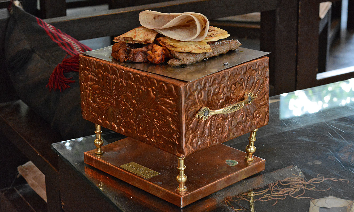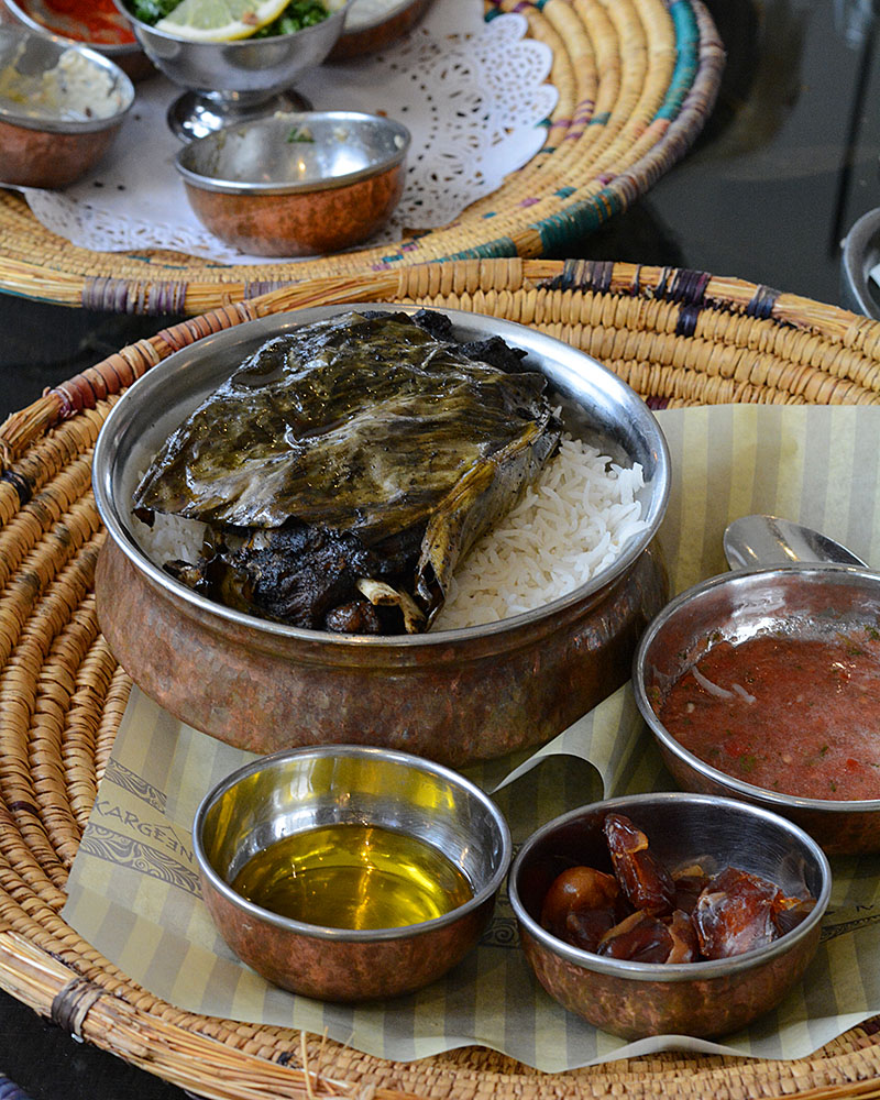 Fairy lights twist through trees and sweet smoke from the shisha coils beneath lanterns in the canopy at the sultry Kargeen Caffe. This is one of Muscat’s best-loved restaurants; inside its grounds you’ll find families feasting in dining rooms, men lounging in courtyards blowing flawless smoke rings and fashionistas with heels and handbags worth many months’ rent glimmering in hidden alcoves.