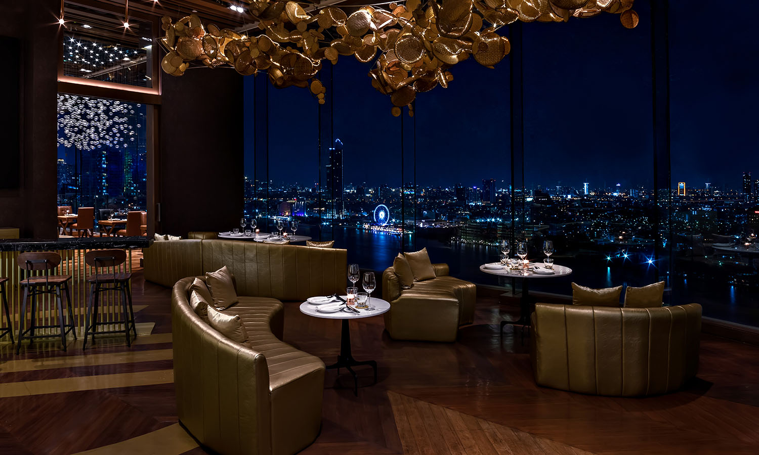 ‘Sin and be seen’ is the motto at this ritzy rooftop bar, a not-so-subtle hint at the sultry vibe you can expect upon arrival. Mirroring the glittering Bangkok skyline, this indoor-outdoor space, located on the top floor of the Avani+ Riverside Hotel, is dripping in luxury, with gold accents, art deco-inspired details and plush furnishings.
