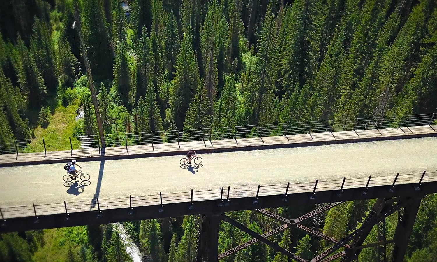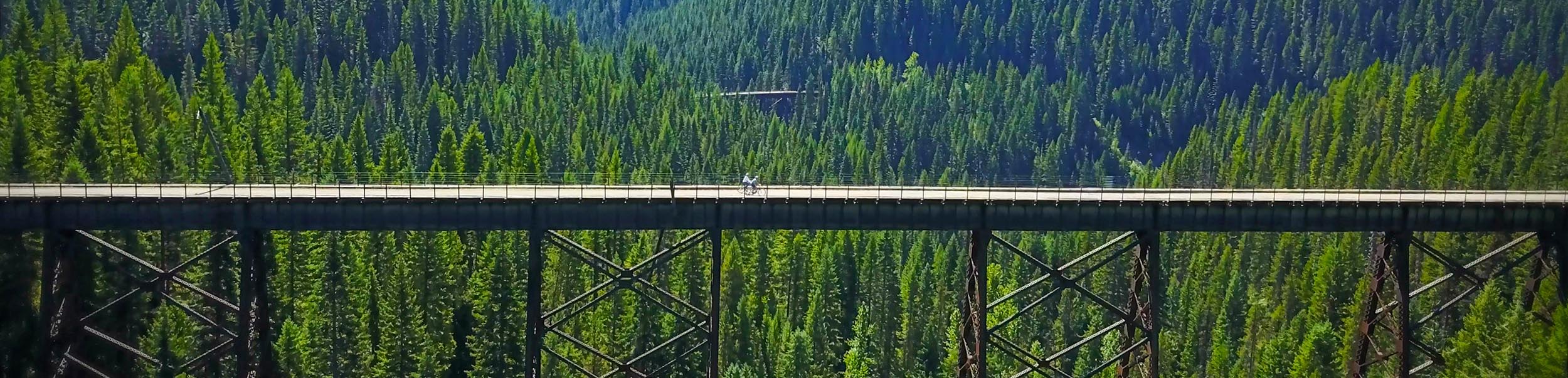 The Route of the Hiawatha winds through the rugged Bitterroot Mountains in the St. Joe Ranger District of the Idaho Panhandle National Forest along an abandoned section of the Milwaukee Railroad. Its gentle 1.6-percent to 2-percent, all-downhill trail straddles the Idaho-Montana state line for 15 miles, through 10 dark tunnels and crossing seven sky-high steel train trestles.