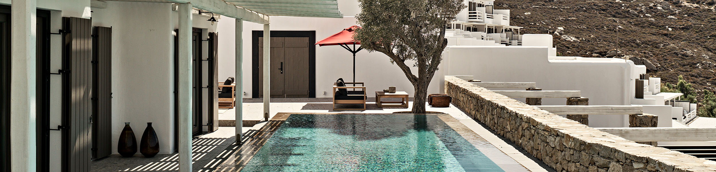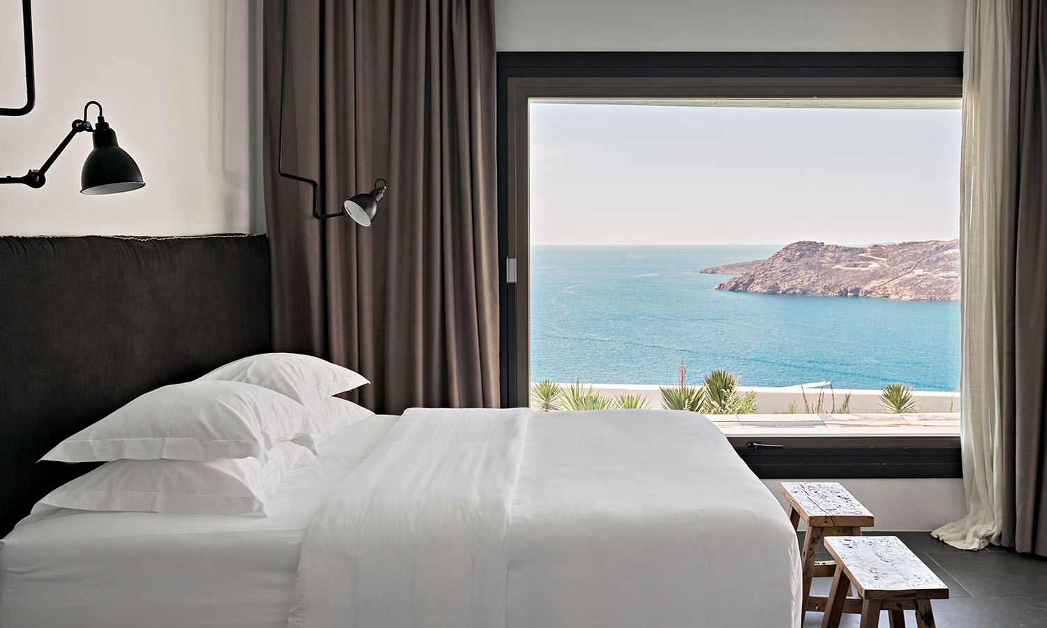 Extending from the rocky cliffside, the boutique property occupies a private stretch of the famed Elia Beach, complete with unencumbered views of the cerulean and sapphire waters of the Aegean Sea. Vestiges of the island’s Cycladic heritage are evident in the hotel’s design – think charcoal concrete floors, whitewashed walls, timber-framed windows and vintage furnishings.