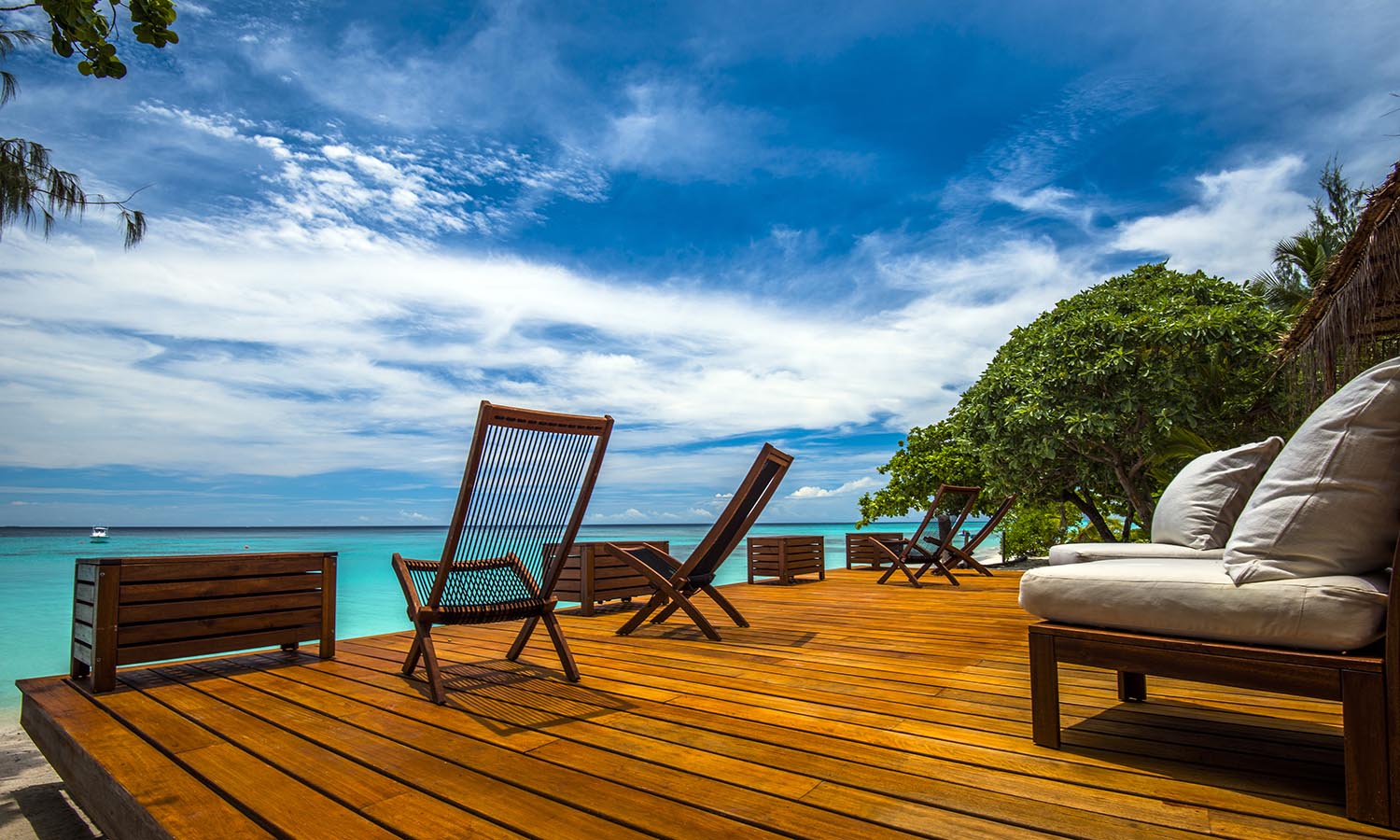 There's also a beachfront deck and a balcony overlooking the stunning archipelago and lagoon waters, with other-worldly aqua-blue colours.