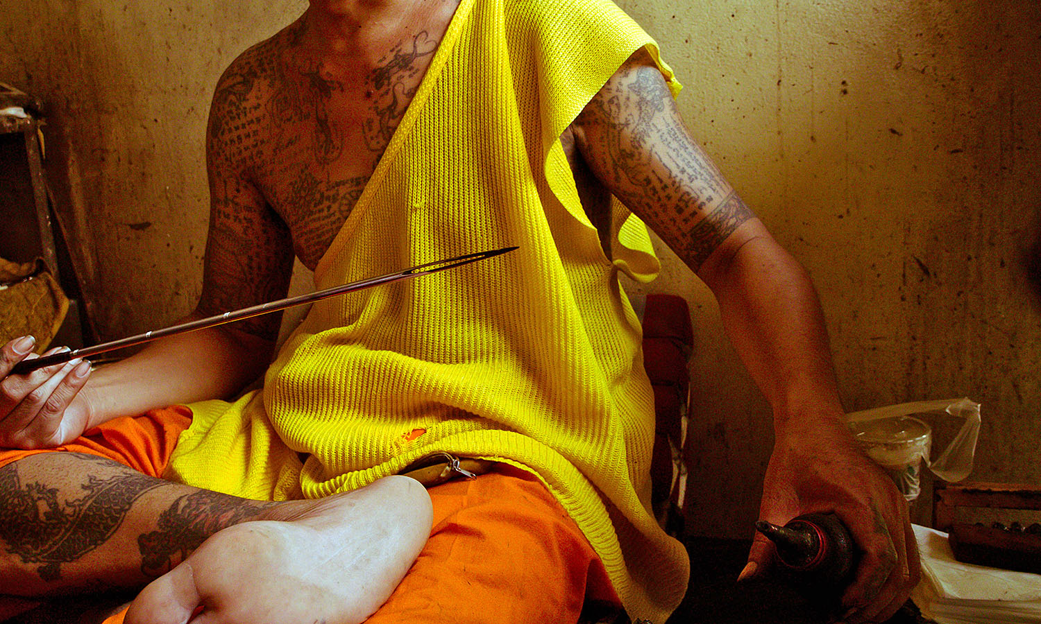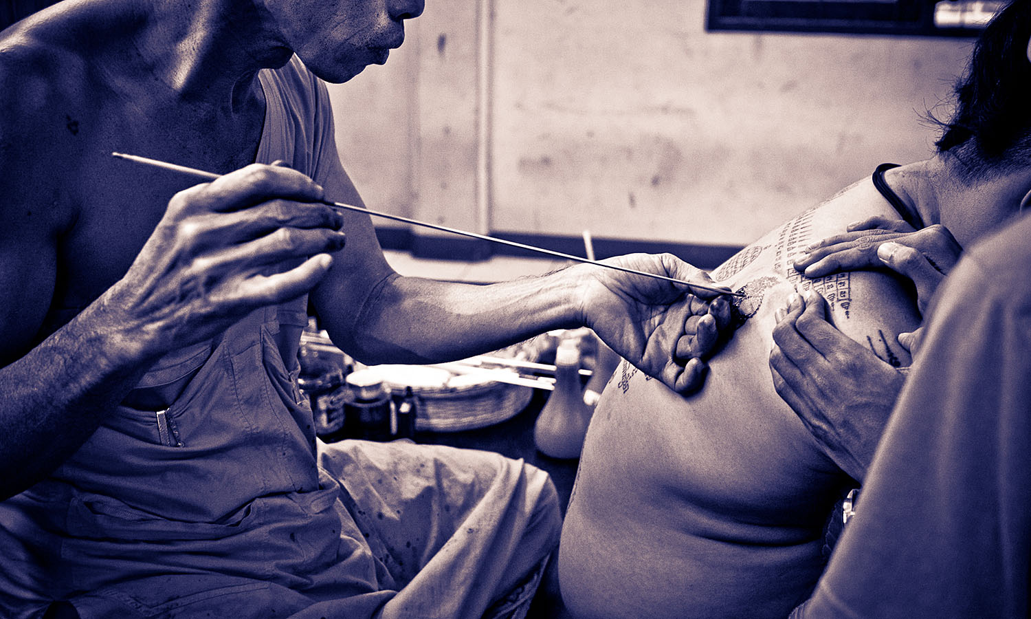 Before you’re poked and prodded, custom requires you to step into the role of assistant – a practice dividing the proud from the petrified. Clamp still the poor sap before you, so they can’t squirm as the double-pronged instrument plunders their skin. Each tattoo requires at least 3,000 jabs before the template gives way to a final bloody welt, giving you plenty of time to reassess your vanity. Once your buddy’s stamp is blessed, present your flesh and set your face to stoic. As the monk swills his used needle in a pot of alcohol, you better hope your new stamp protects you against more than just evil spirits.