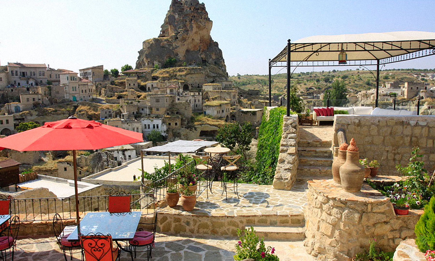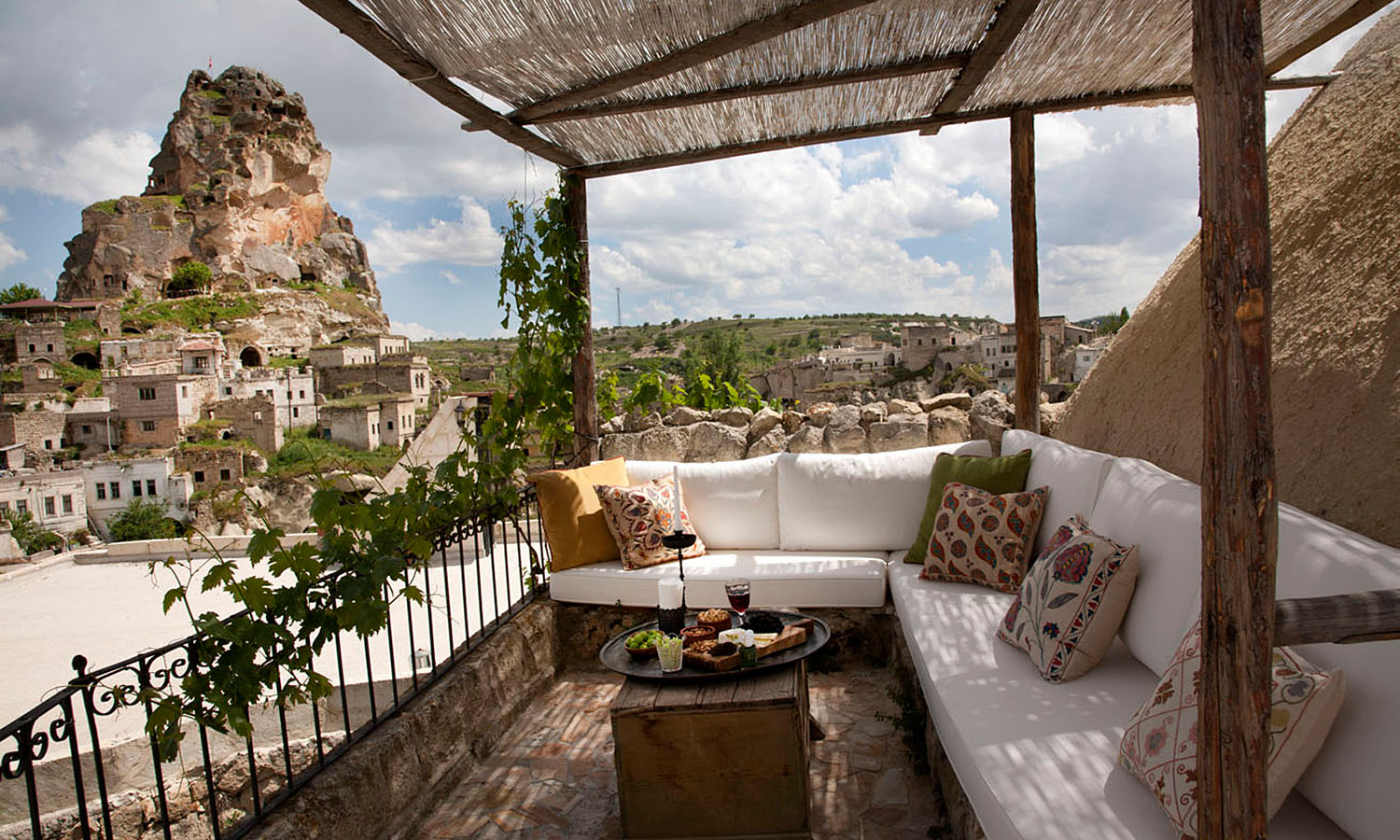 Each alcove and shelf has been hand carved with pockets of light accentuating the rock detail. Multiple terraces provide the perfect vantage point for enjoying the dramatic scenery, with views out across Ortahisar Castle. Located out of the tourist hub, this petite hotel has a homely atmosphere and is a Cappadocian experience in itself.