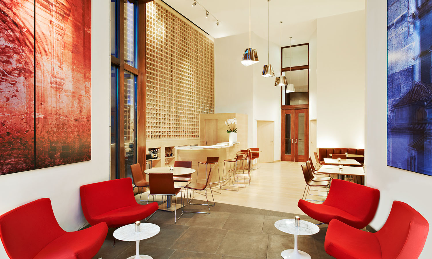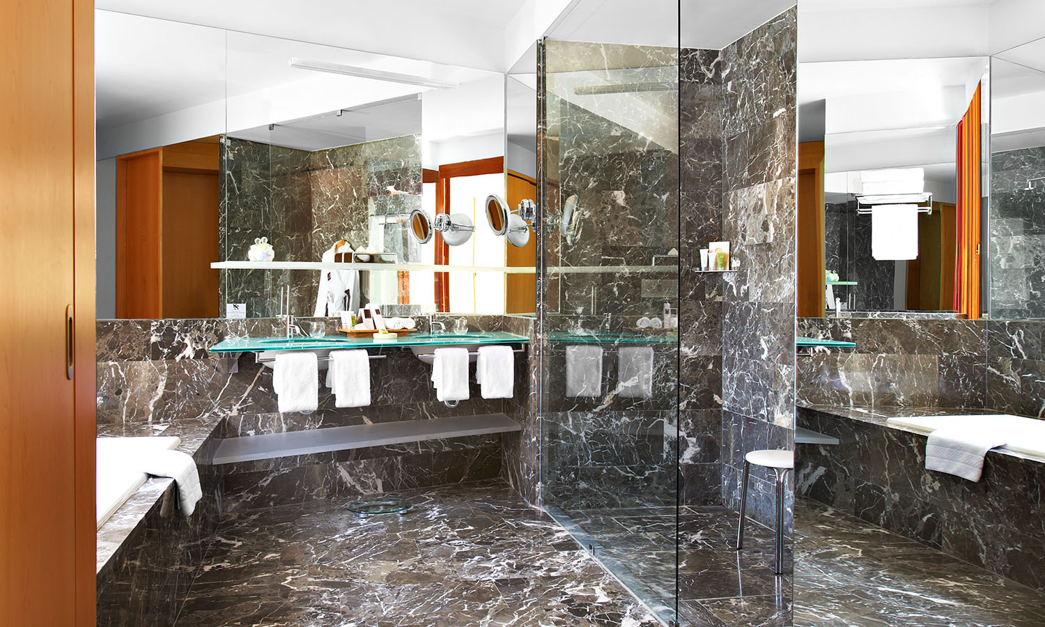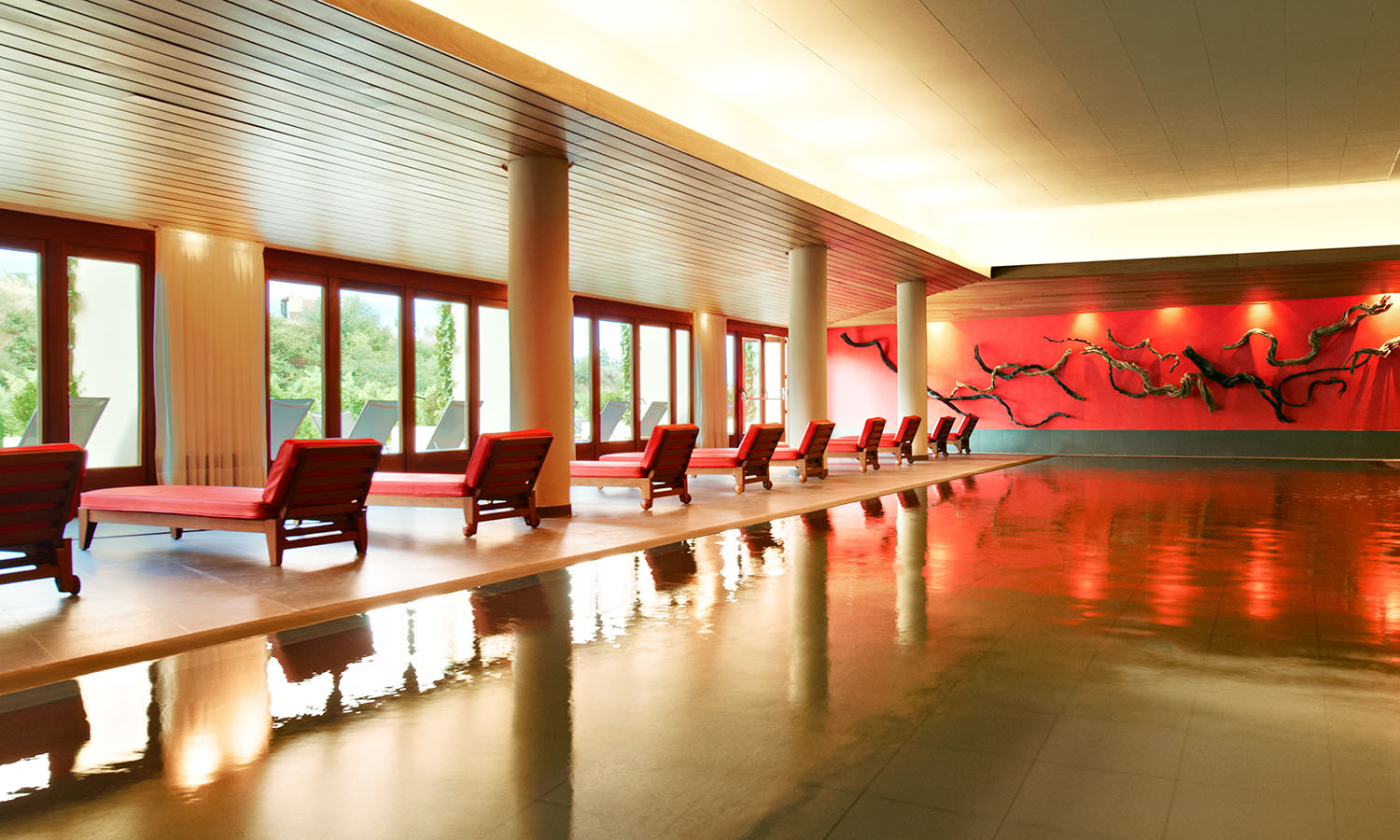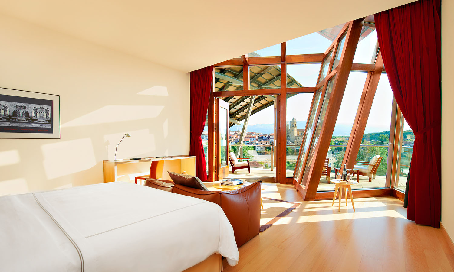 Gleaming ribbons of titanium almost mimic the undulating surrounds, while the tilted walls and cathedral ceilings contrast with the warmth of wood and canny homely touches found in the 43 rooms and suites. We imagine that sipping tempranillo on the angled terrace while gazing across to the medieval town of Elciego would keep most lovers of wine and design satisfied for quite some time.