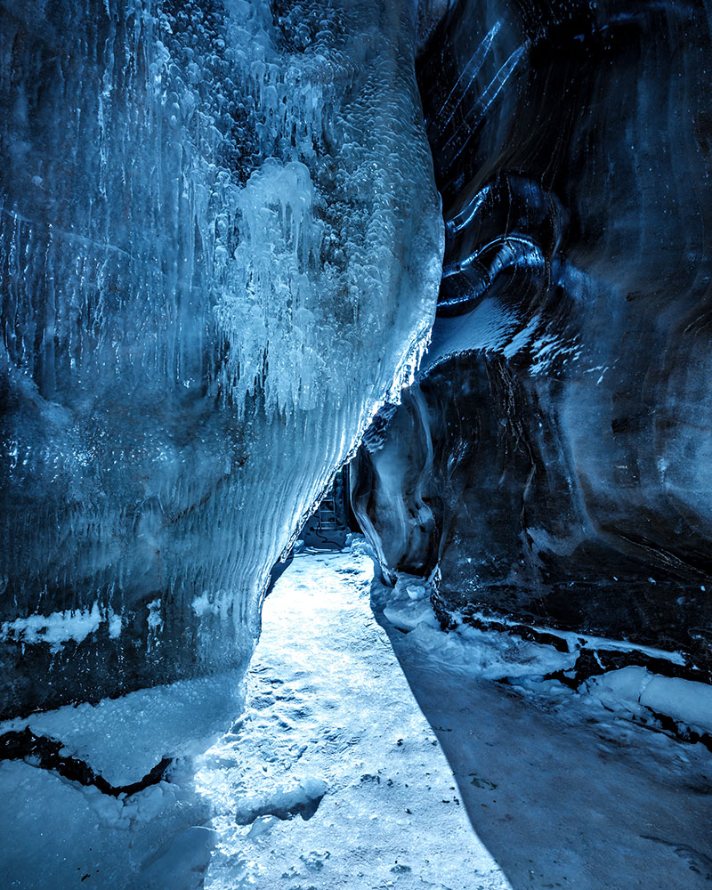 There is a level of claustrophobia entering the ice cave, combined with potentially very cold conditions. Technically, taking successful photographs in this environment can be a challenge, but if the principles are followed amazing shots are possible.