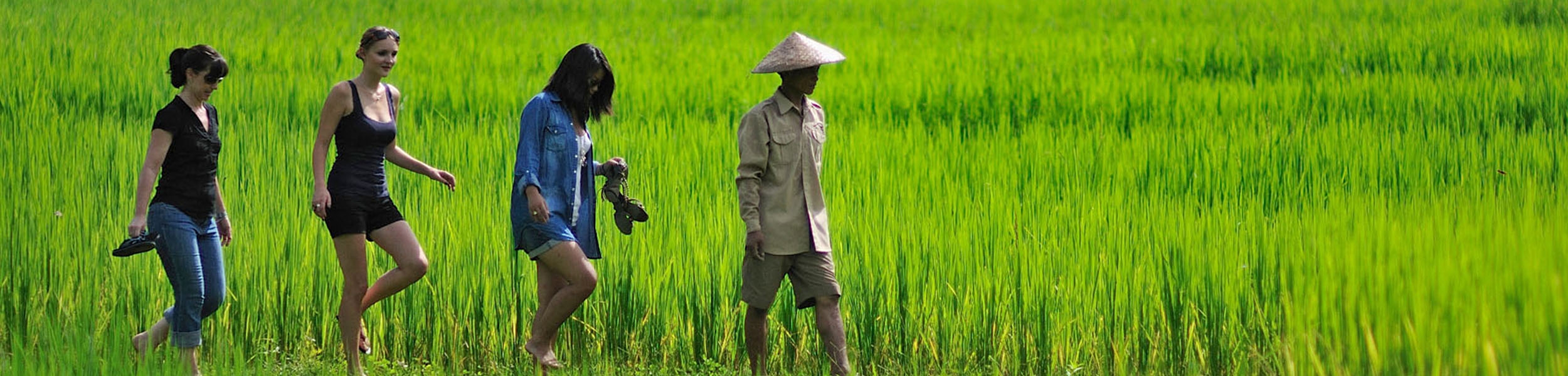 Meals – brekkies of eggs, bacon, baguettes and jam, and dinners created using locally sourced produce – are served in a stilted pavilion overlooking lush rice paddies. During the day you can go hiking, help plant and harvest rice, or try your hand at net fishing. There are also excursions to the nearby Pak Ou Caves.