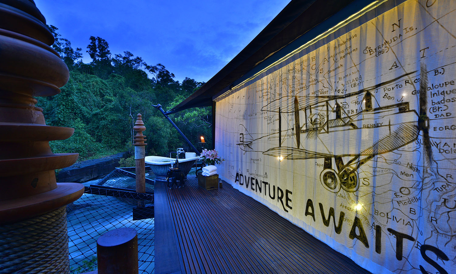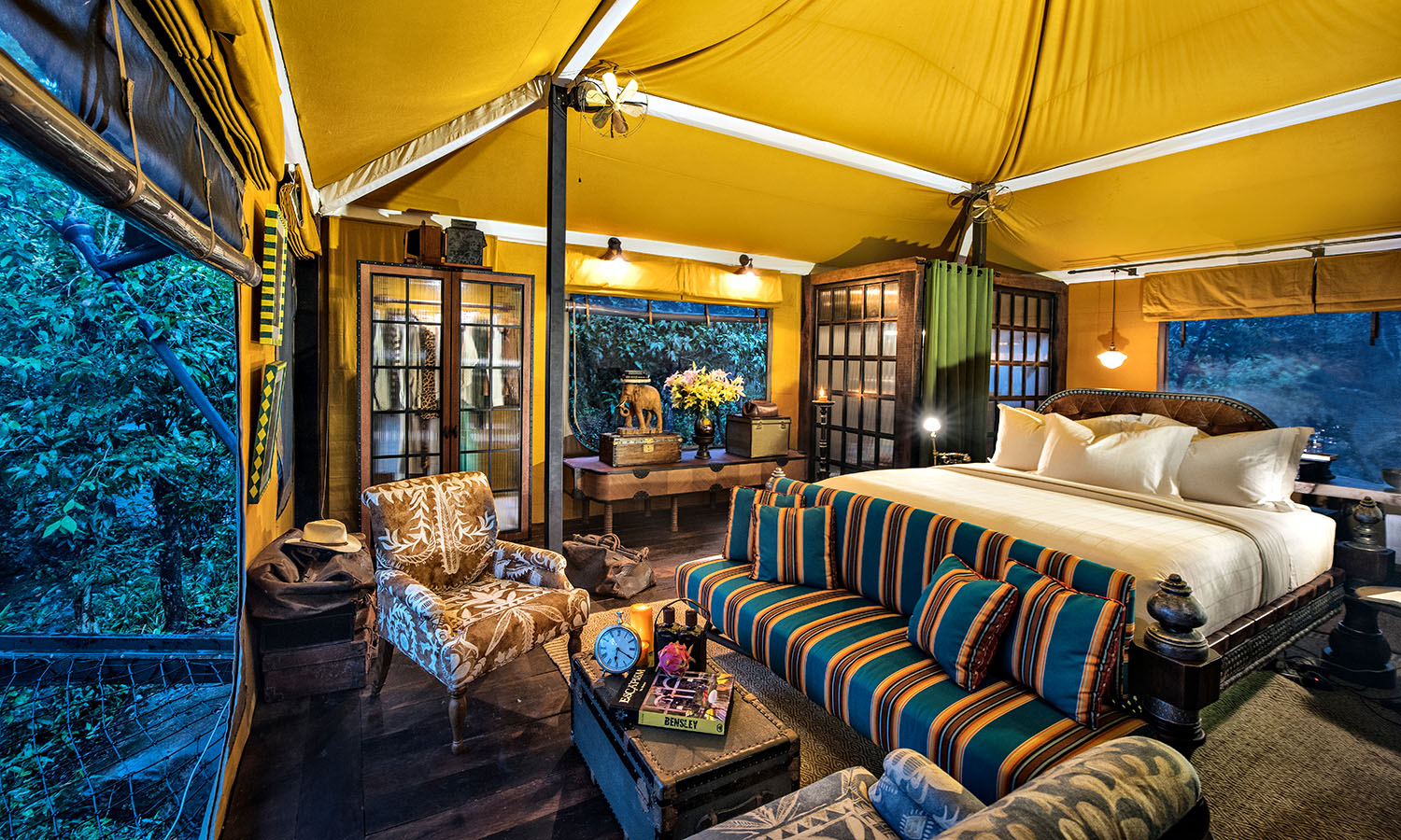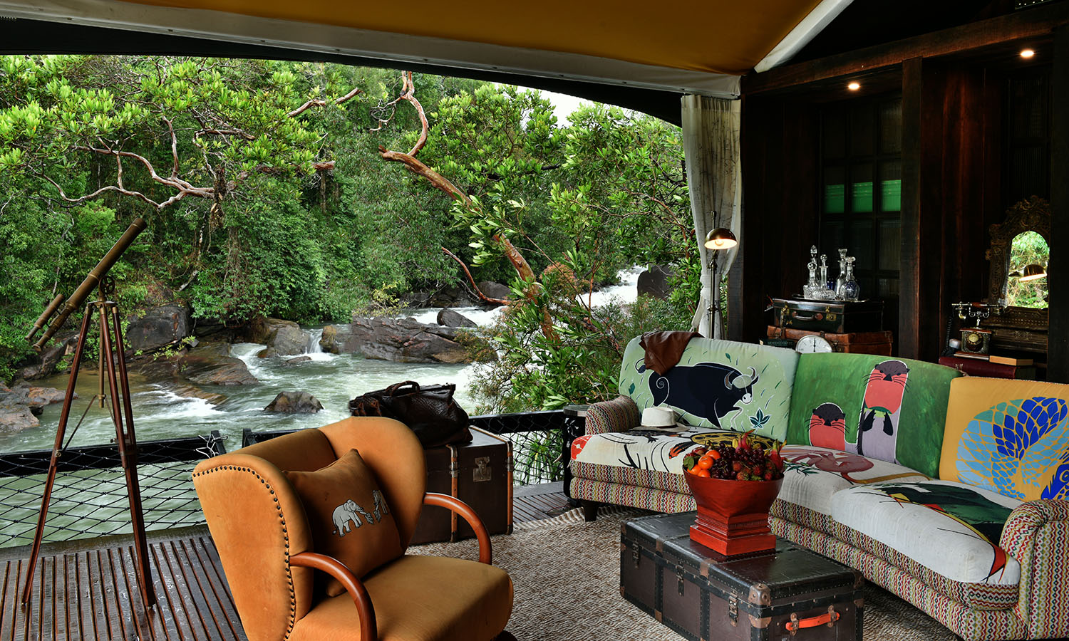 Some of the 15 glamorous tents – they have outdoor decks with slipper bathtubs – hang right out over the river and overlook waterfalls to create a truly unique jungle experience. All of them are set on stilts so as not to upset the migratory patterns of the wildlife.