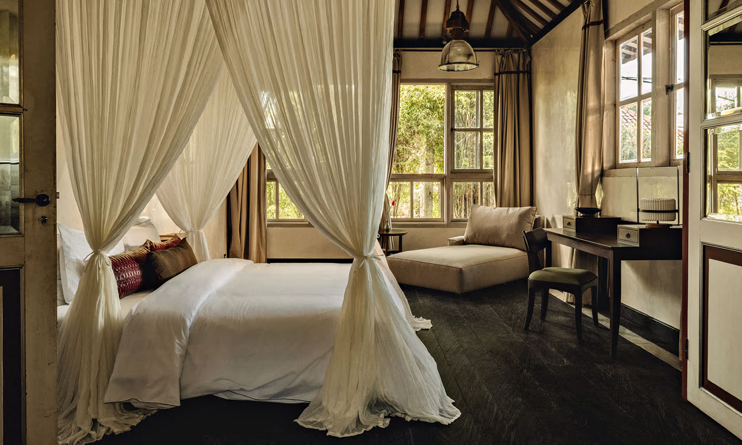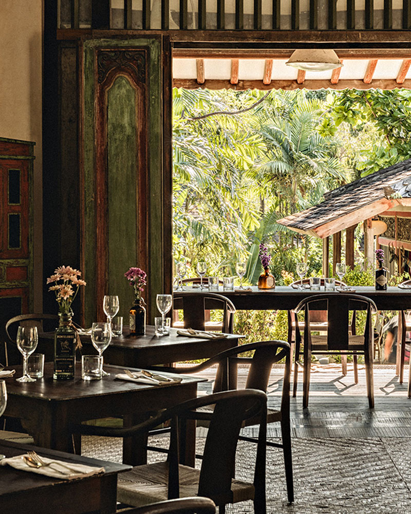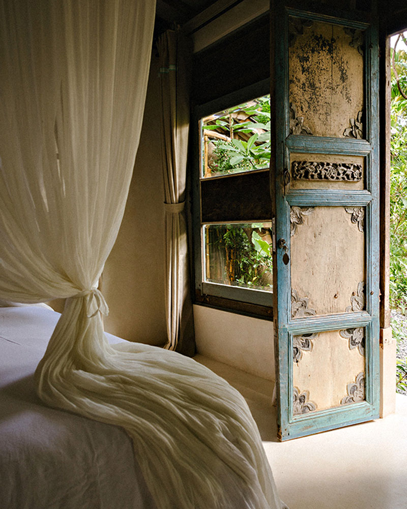 The vision of husband-and-wife duo Jacopo and Rosa Sertoli, Magia de Uma was designed around preservation rather than polish. Rooms are spread across a central villa and a cluster of bungalows, some built around 150-year-old Javanese joglo structures that bring serious gravitas to an otherwise laid-back setting. Original wooden floors, high ceilings and simple white linens keep things calm, while Indonesian craftsmanship runs deep; carved timber doorways, vintage furniture and ancient farming tools repurposed as sculptural details.