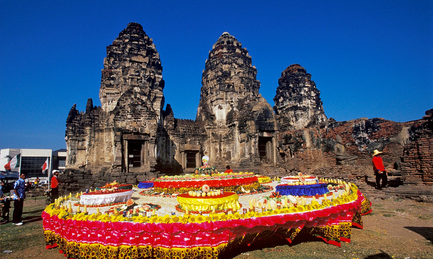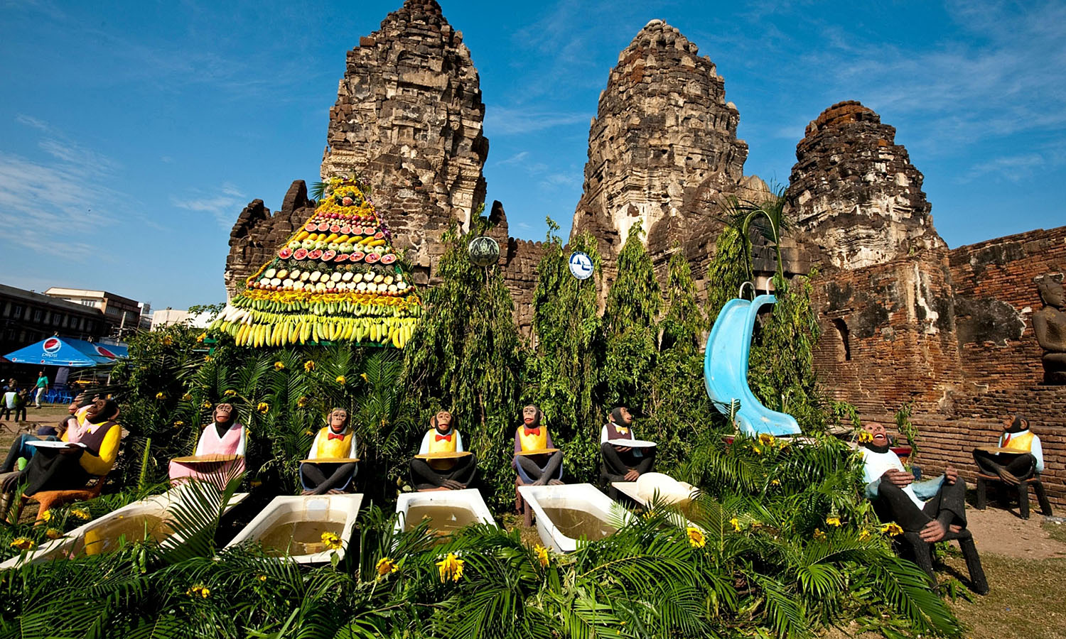 The feast takes place at the Khmer ruins in Lopburi in November.