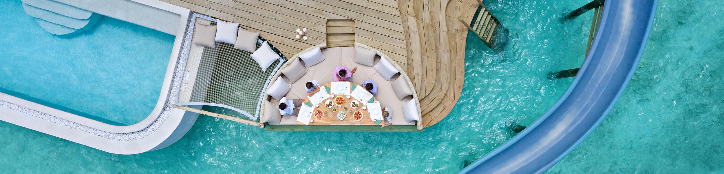 With a choice of either sunrise or sunset views, the villas also feature a large deck with plush loungers, a sunken seating area and catamaran nets upon which to laze. And when you’ve had enough of relaxing in the sun and want to cool off, simply slip down your very own slide into the inviting turquoise water.