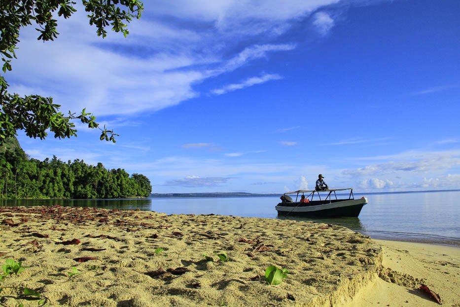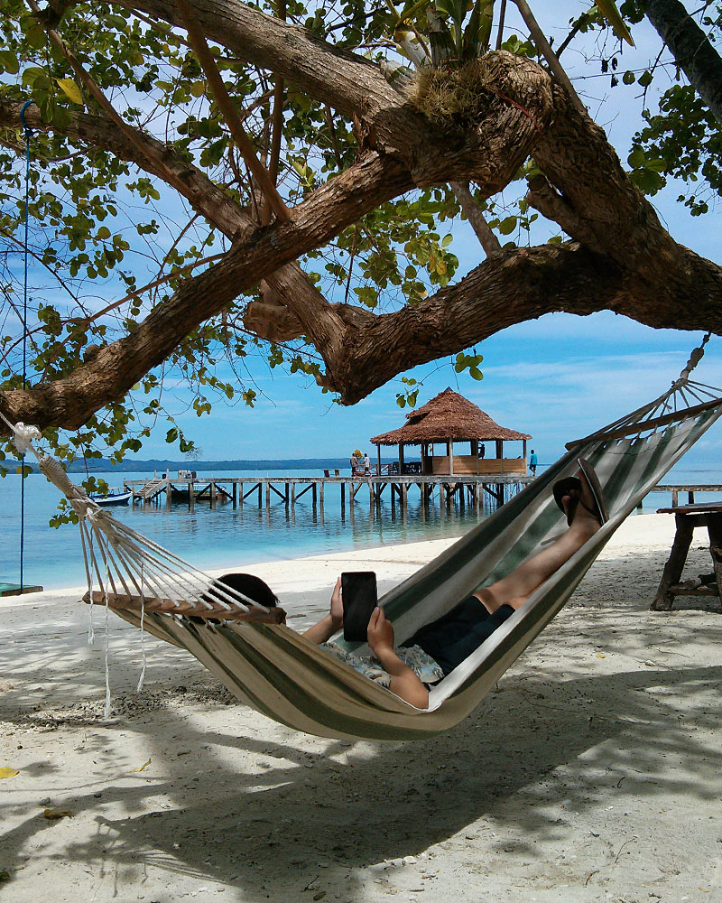 It’s about a half-day journey to Ora Beach Resort, so be prepared for an adventure. There are regular flights to Pattimura Airport in Ambon from Jakarta, Surabaya and Makassar. Once there, take a taxi to Tulehu Port (45 minutes) to catch a ferry to Masohi on Serram Island. Journey by car to the fishing village of Saleman (about two hours), before finally taking a short 10-minute boat ride from the village to the resort.