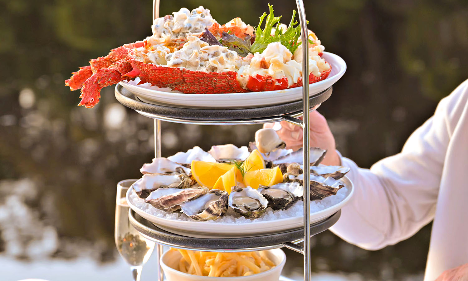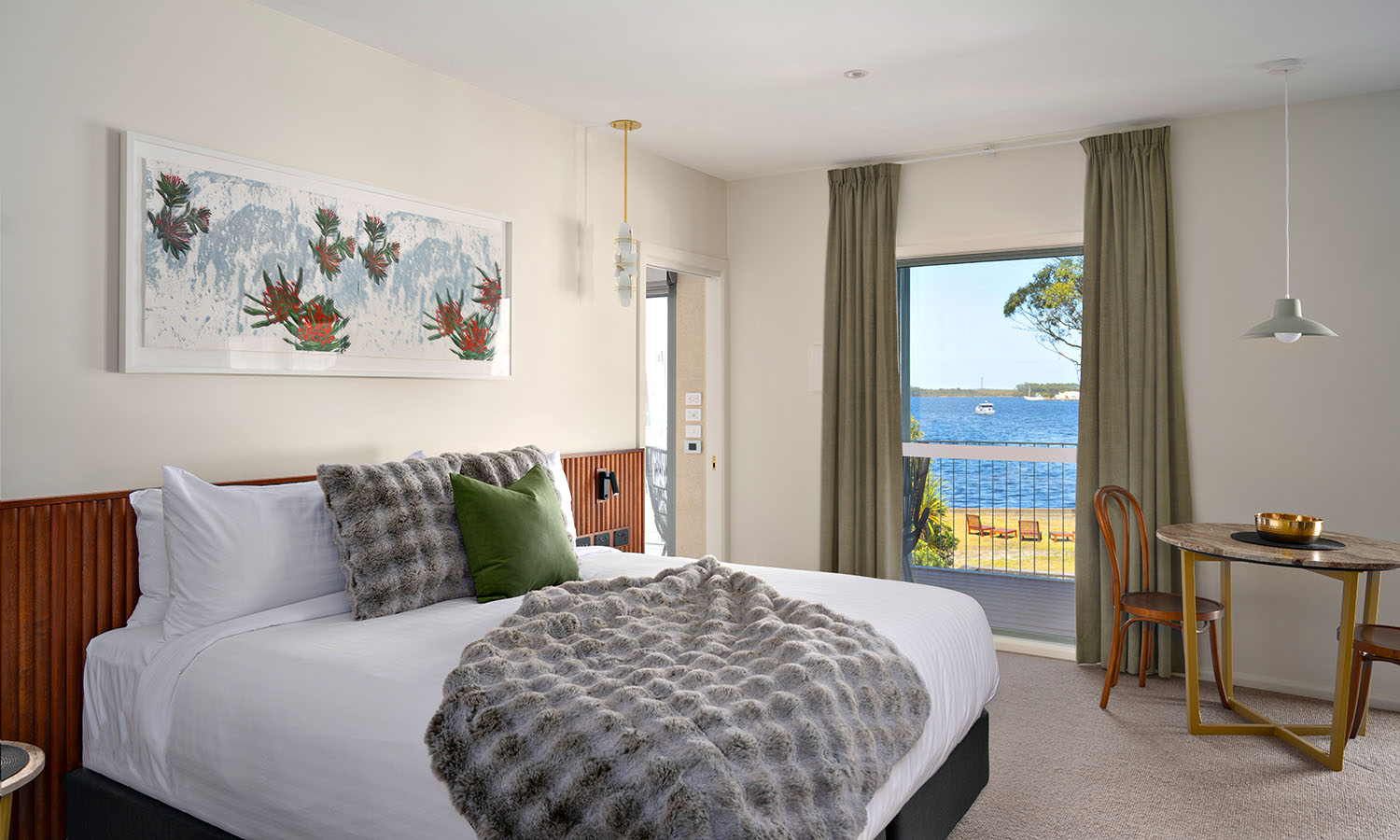 Risby’s restaurant, long a Strahan favourite, has been reimagined too. Floor-to-ceiling windows frame shifting moods of Macquarie Harbour while dishes tell stories of land, sea, and the region’s history, from salvaged Huon pine to fire-finished Tasmanian oak tables. Every detail whispers West Coast pride.