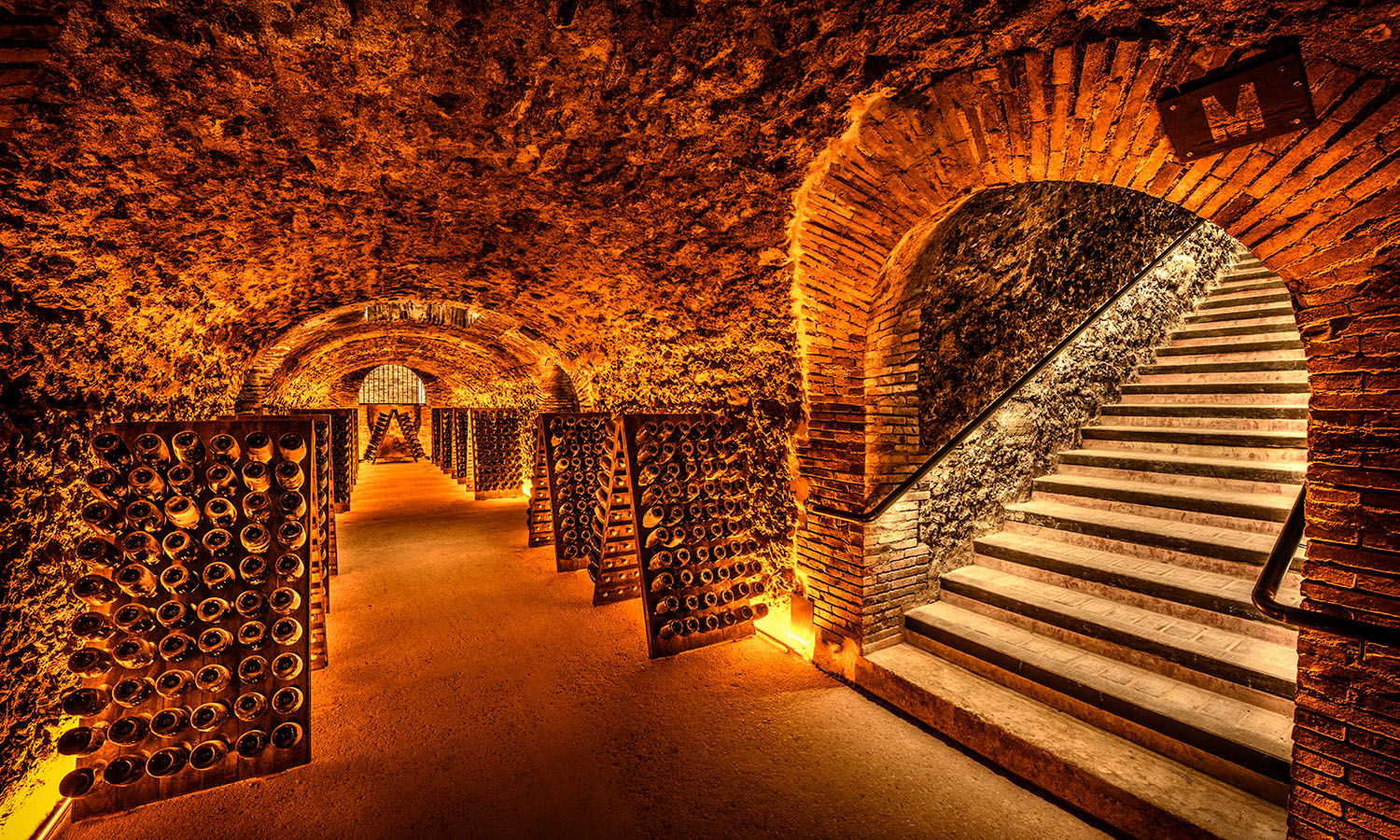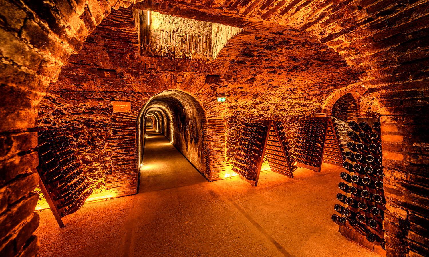 Beneath the historic vineyards of Épernay in the Champagne district is a series of winding tunnels and hidden caves dug into the chalk. Some date back to Roman times and, apart from a period during World War I when the townspeople hid there to flee the conflict, they’ve been used to store and mature bottles of the region’s famous sparkling wine.