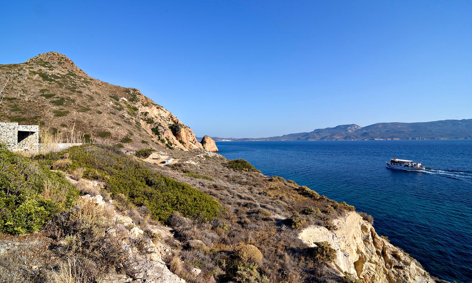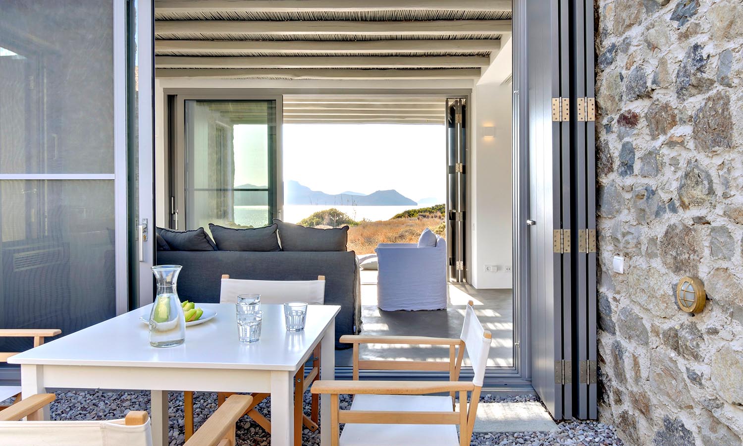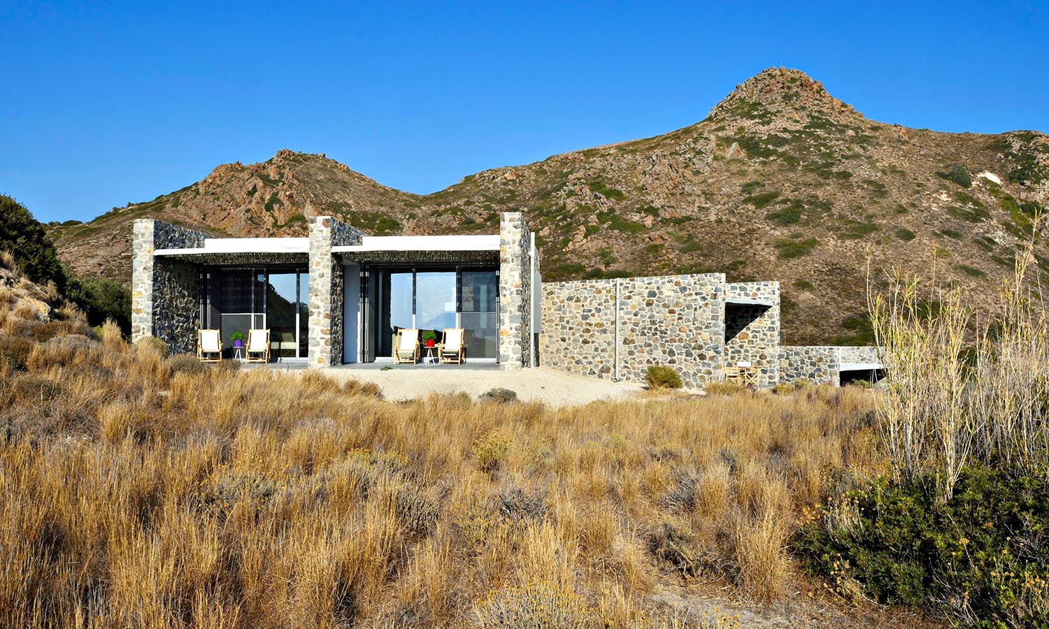 At first glance, Skinopi Lodge could be a mirage. A blip on the horizon of an ancient, rocky landscape with the crystal blue waters of the Aegean in the distance.