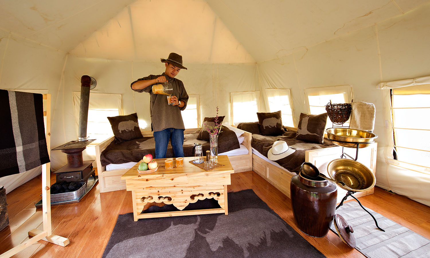 Travel often takes us back in time and Norden Camp is no exception. Built by Tibetan nomads, the retreat has been designed to share the heritage of the land and people with its guests, fusing comfort and eco-sustainability with culture. Eight log cabins constructed from pine found in the woodlands and four hand–spun yak-hair tents dot the countryside, each featuring timber floors, luxe bedding and local antiquities.
