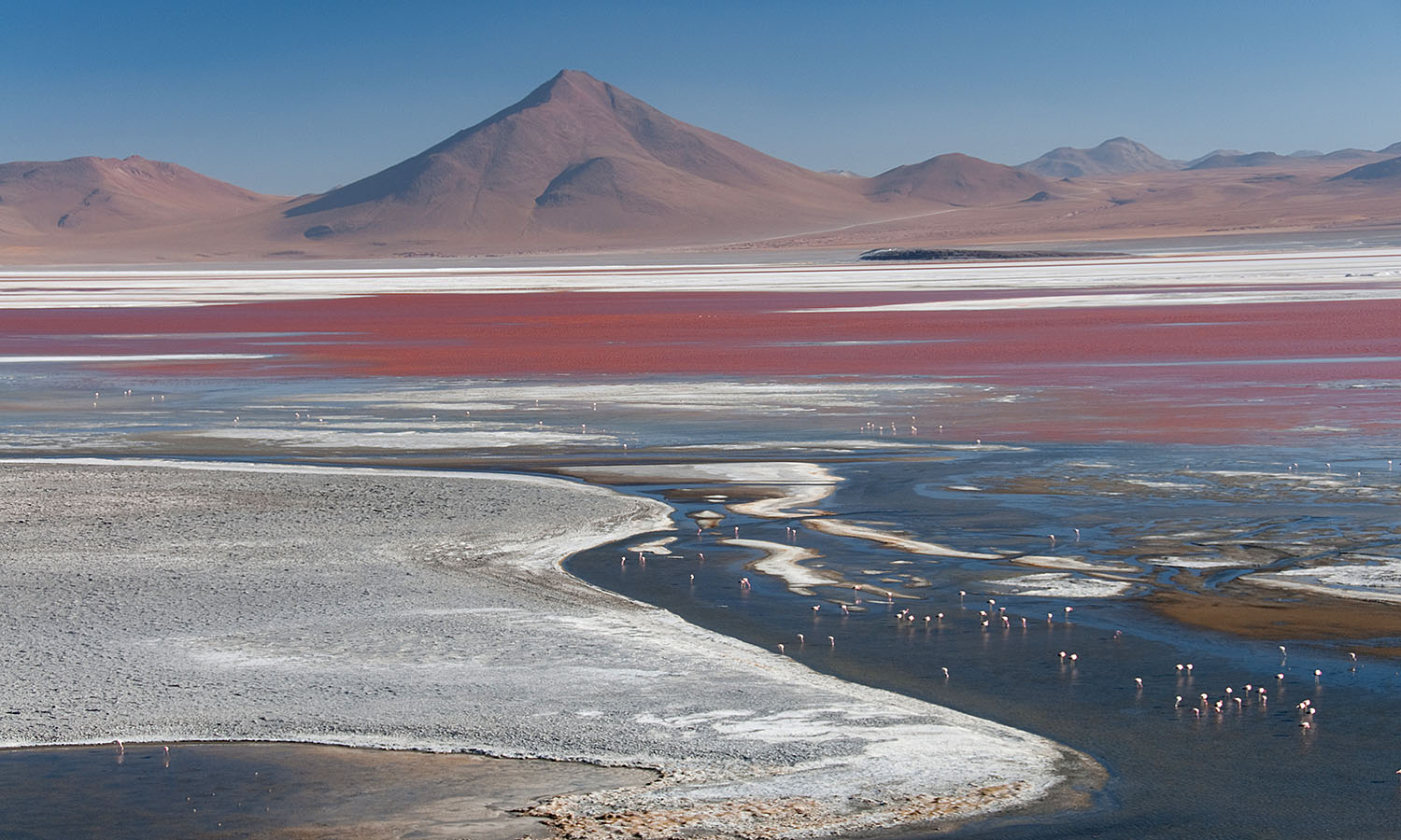 Welcome to a natural landscape that appears positively extraterrestrial. Laguna Colorada, meaning red lake, is a shallow salt lake in Bolivia’s Altiplano (high plains), more than 4,260 metres above sea level. The lake is less than a metre deep and owes its unusual colour to red minerals and algae, which lure flocks of rare species of flamingo.
