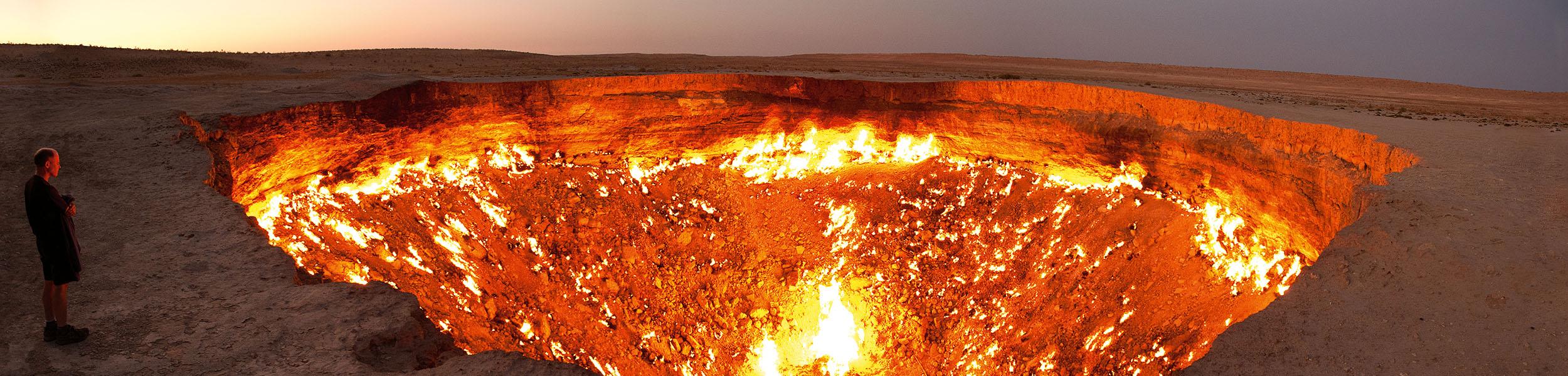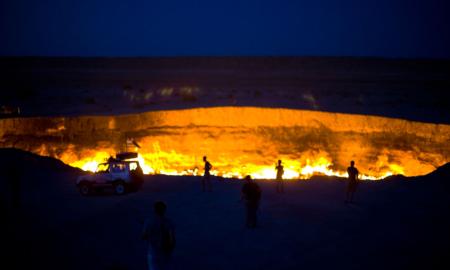 Flames flare across a pit of boiling mud in the heart of Turkmenistan’s Karakum Desert. Derweze, or the ‘door to hell’ as locals know it, is a glowing 70-metre-wide sinkhole and a sinister legacy to gas mining.