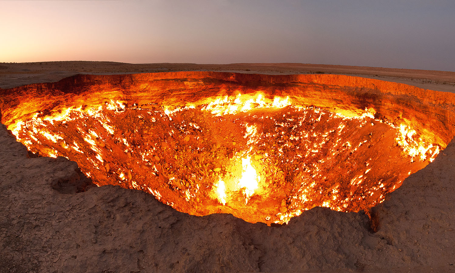 The crater formed when the ground beneath a rig collapsed as Soviet geologists drilled for resources in one of the largest natural gas reserves in the world. The pit devoured the machinery and methane gushed into the air, threatening a nearby village. To truncate the flow, geologists set the deposit alight, assuming it would burn off in several days. Fed by rich natural gas, the fire continues to burn decades later.