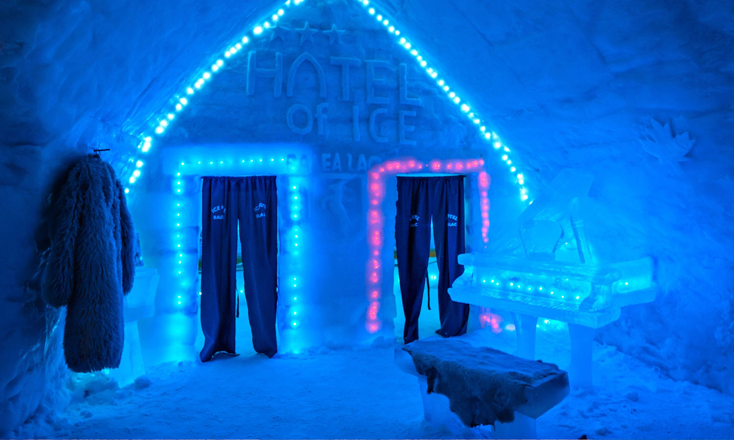 The temperature in the Hotel of Ice is typically around -2 degrees with professional sleeping bags and cosy bedding provided.