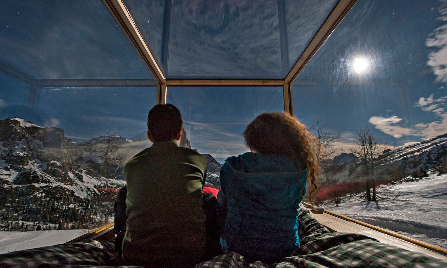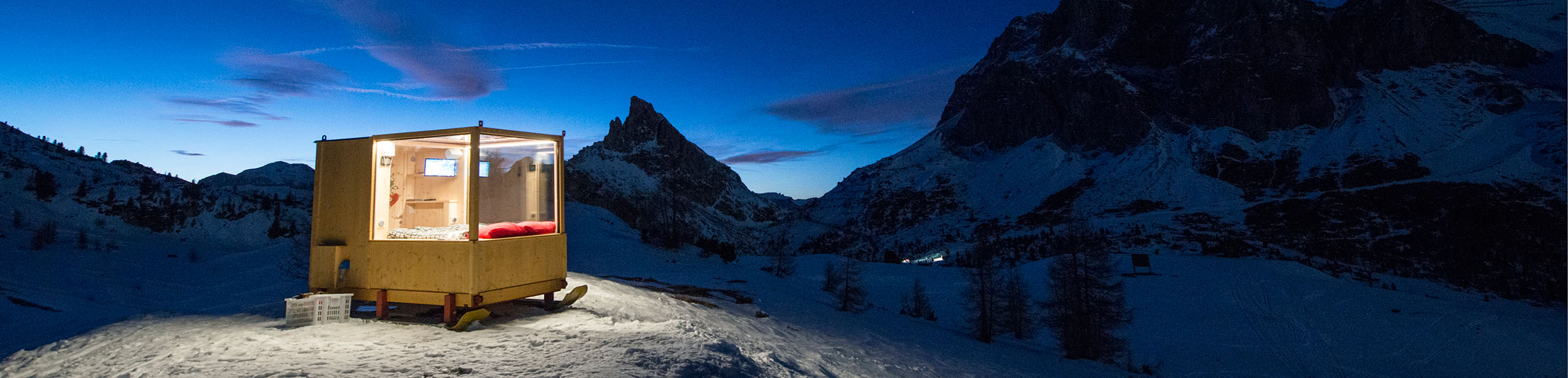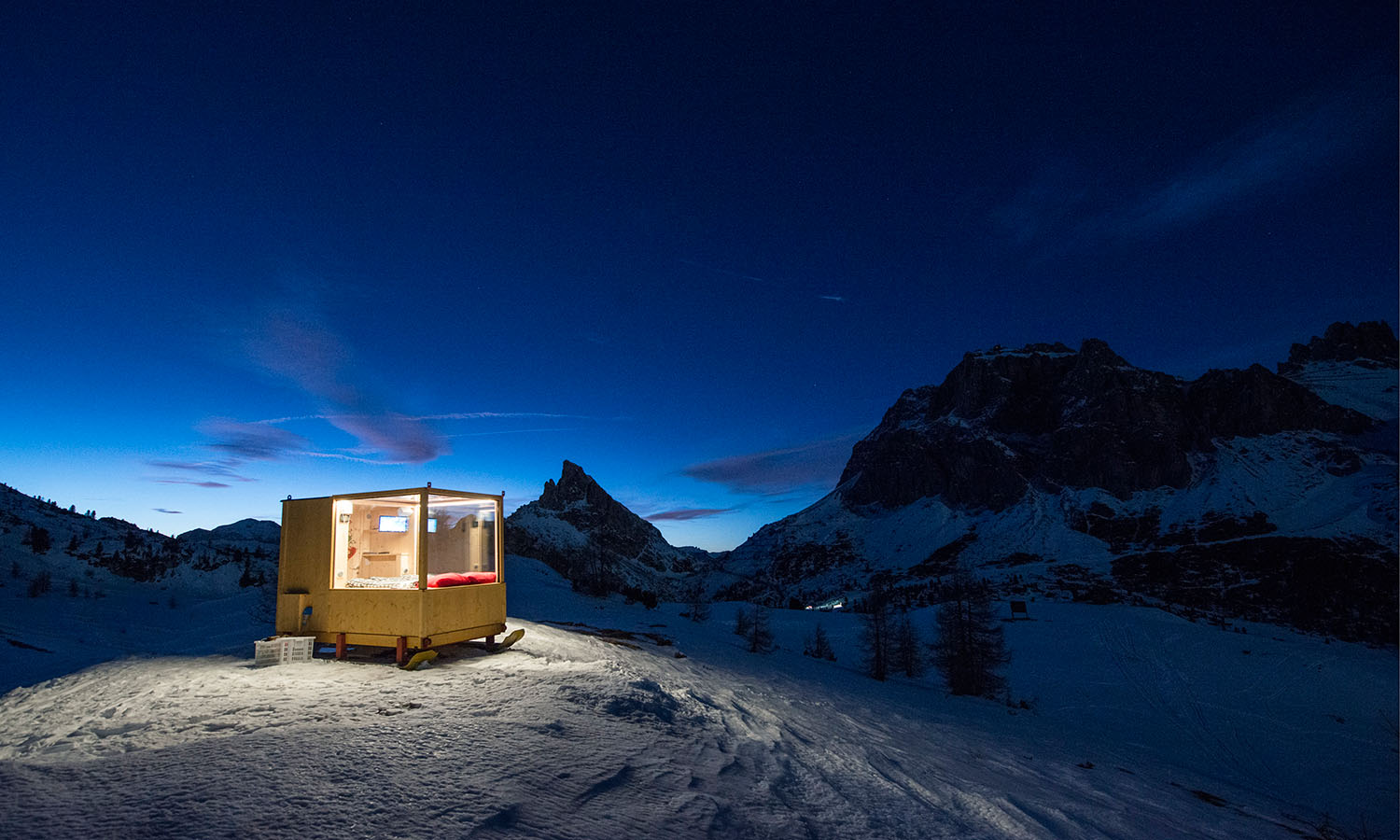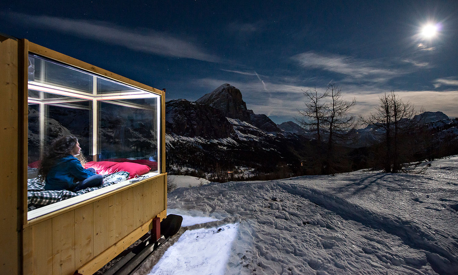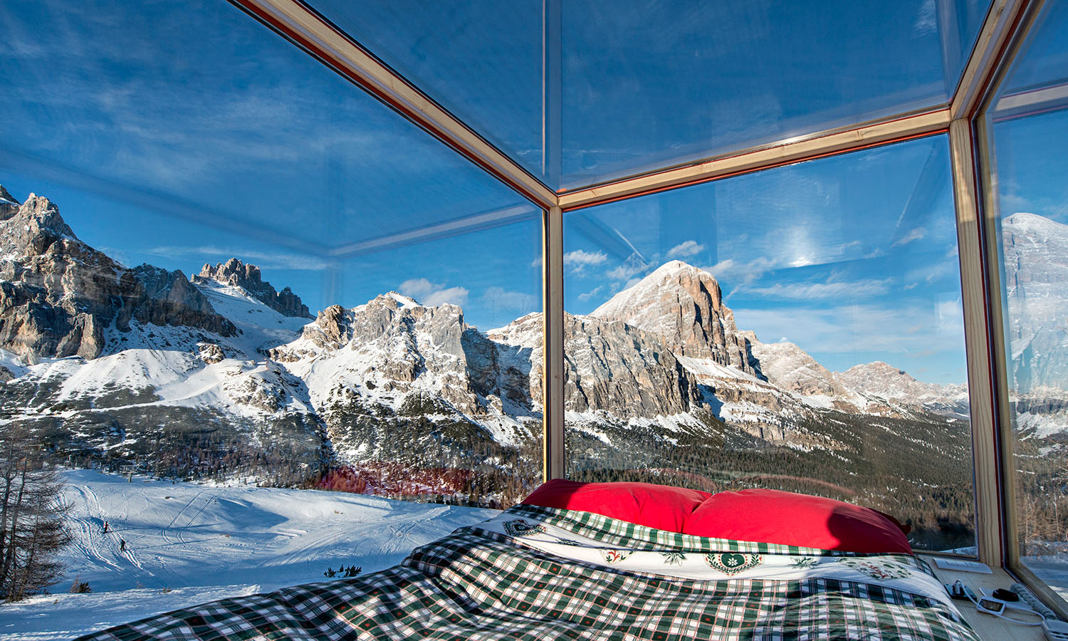 Snag a front-row seat to watch the sun set and stars sparkle over the UNESCO World Heritage-listed Dolomite Mountains without ever leaving your bed. Dropped into the snow at an altitude of 2055 metres above sea level, this sled-turned-glass cube bedroom (don’t worry, the skis are just for show) naed the Starlight Room immerses guests in the snowy peaks of northern Italy. Col Gallina ski resort is a few kilometres away and the room is accessible via snowmobile or by strapping on a pair of snowshoes and traipsing there. The angle of the double bed is adjustable, so you can get the best view of the constellations while you’re toasty under the covers.