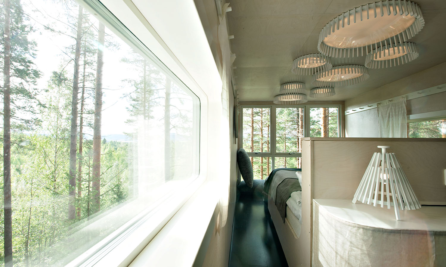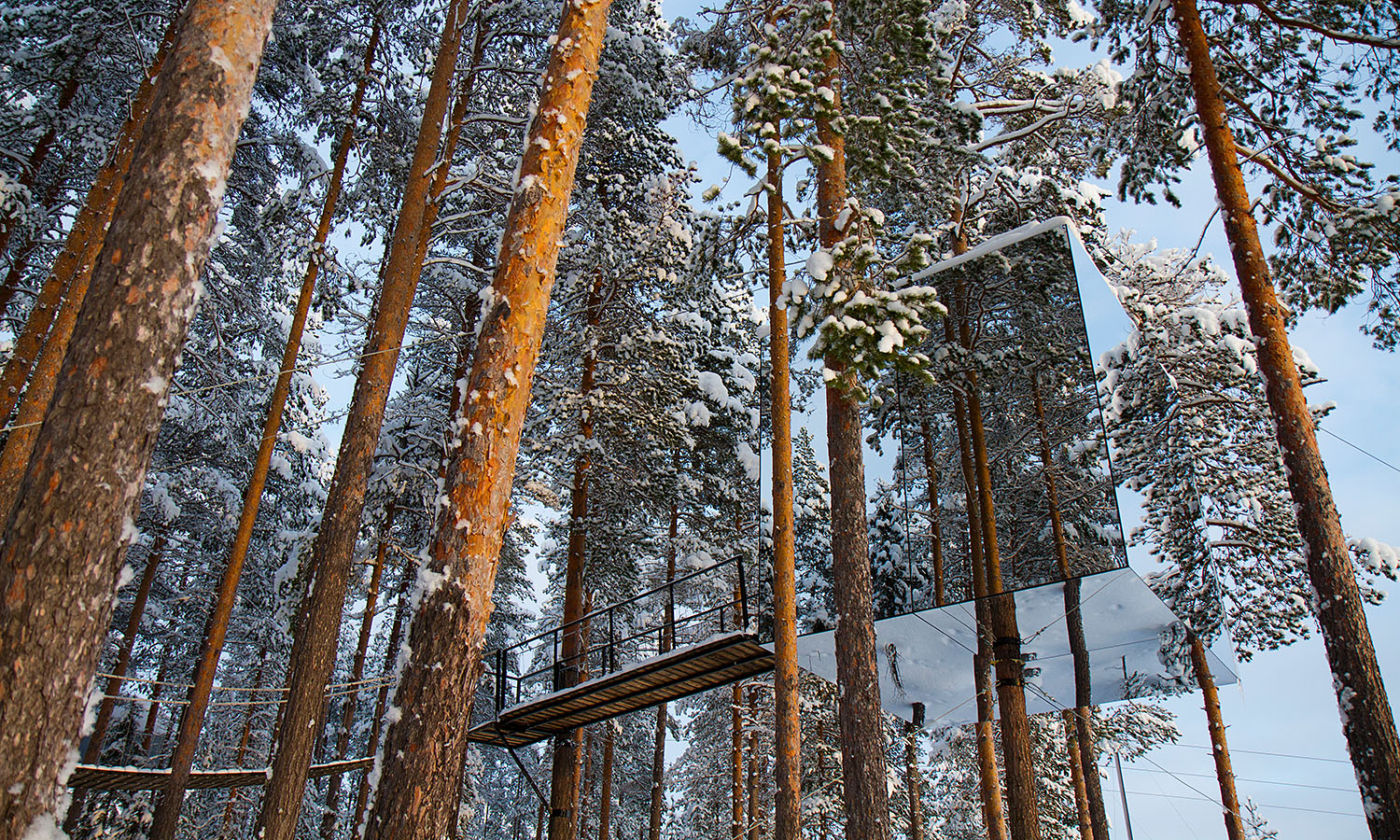 Treehotel is located in a boreal forest approximately an hour by car from Luleå (Kallax) Airport. There are several transportation services offered including a ‘meet and greet guided tour,’ a car service, a snowmobile safari in winter and helicopter transfer.