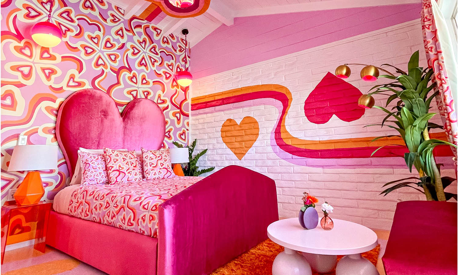 Until it’s time to sashay away, guests can enjoy over-the-top everything from wild wallpaper and art installations, to retro furnishings like flamingo lampshades and heart-shaped beds, all of which make you feel as if you’re actually on a RuPaul set. The neon motel sign, which is visible from the road, would normally be the loudest thing at a motel, but remarkably, it feels almost understated here.