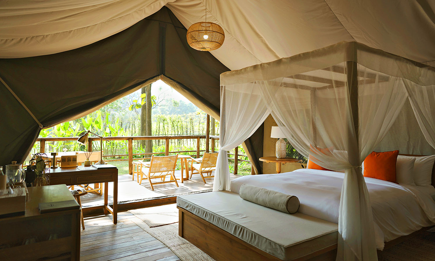 Set among rice fields and mountain backdrops so pretty they could have their own Netflix special, the camp keeps things small and comfortable: just eight high-comfort tents, each with air con, ensuite bathrooms, plush bedding, private decks, and minibars (a necessity when camping, of course).