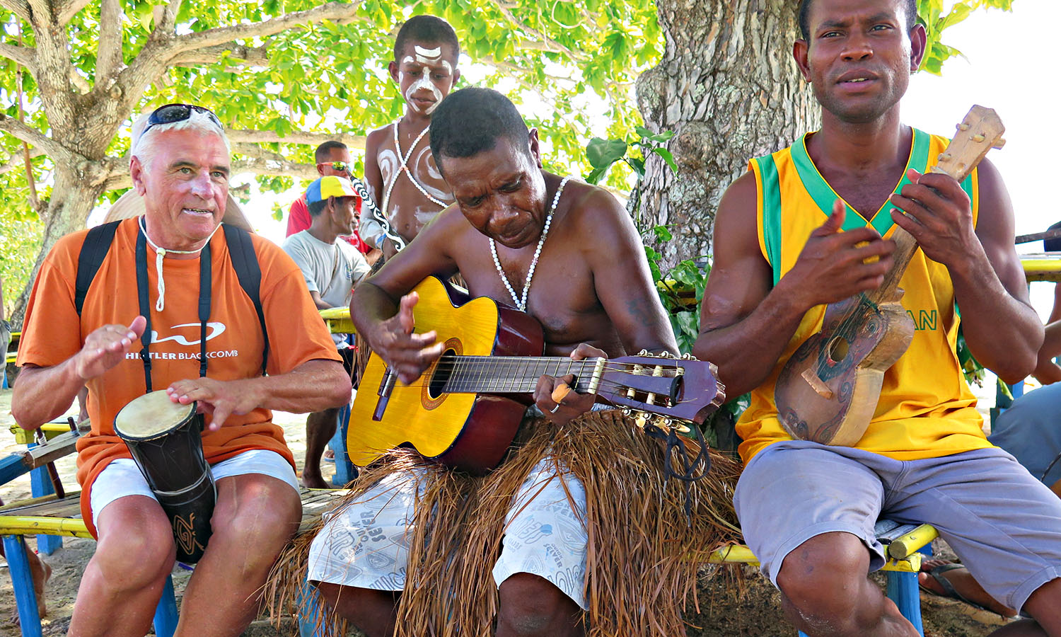 One vibrantly sunny afternoon after a similar welcome on Arborek Island, we enjoy the treat of a local-style lunch. Taro, cassava and fish wrapped in banana leaves are cooked on coals buried under sand. It seems that almost all of the island’s children watch closely as the pit is uncovered and the food unwrapped. We eat our feast serenaded by musicians.