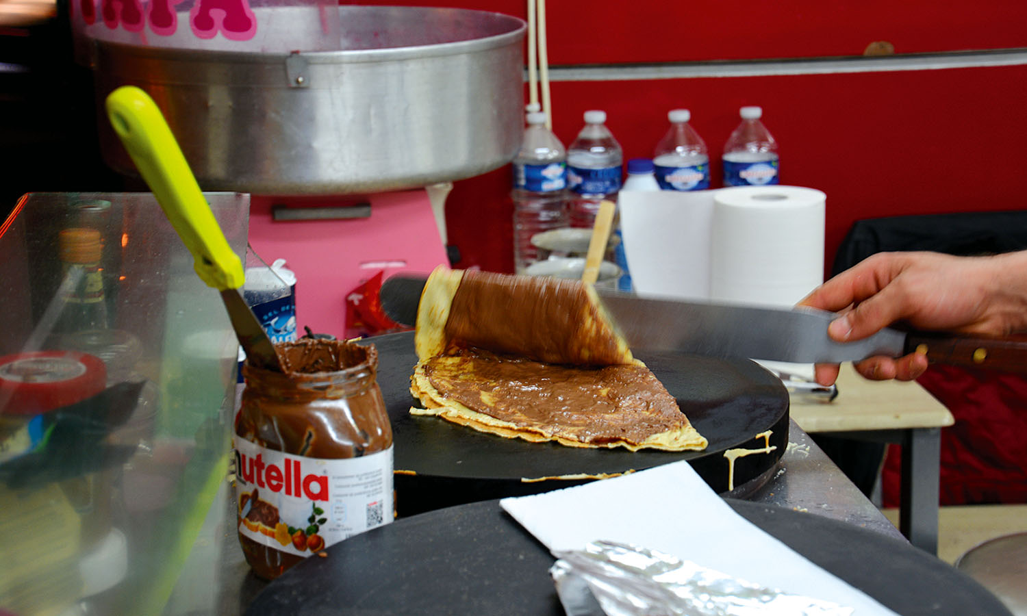 Twice a week the strip running down the middle of Boulevard de Belleville transforms into a marketplace, where cheesemongers sell ripened camembert and North African vendors holler “un euro! un euro!” and hand out segments of sweet clementines. In this spot, just outside one of Belleville métro station’s exits, a stall selling pizza and crêpes stays open on weekends until the sun comes up. You’ll know you’ve made the right snack choice when you smell butter sizzling on the hotplate and the vendor spins crêpe mix around like a record. It will look huge, and now’s the time you might consider offering to share with your fellow merry-makers. Don’t. Once it’s folded into a triangle the warm Nutella floods to the bottom and pools in gooey chambers. There’s no way you’ll want to hand it over halfway. Wander back to your abode, and when you wake sometime the next afternoon just remember Edith’s mantra, “Non, je ne regrette rien.”