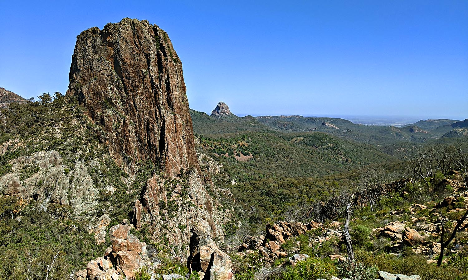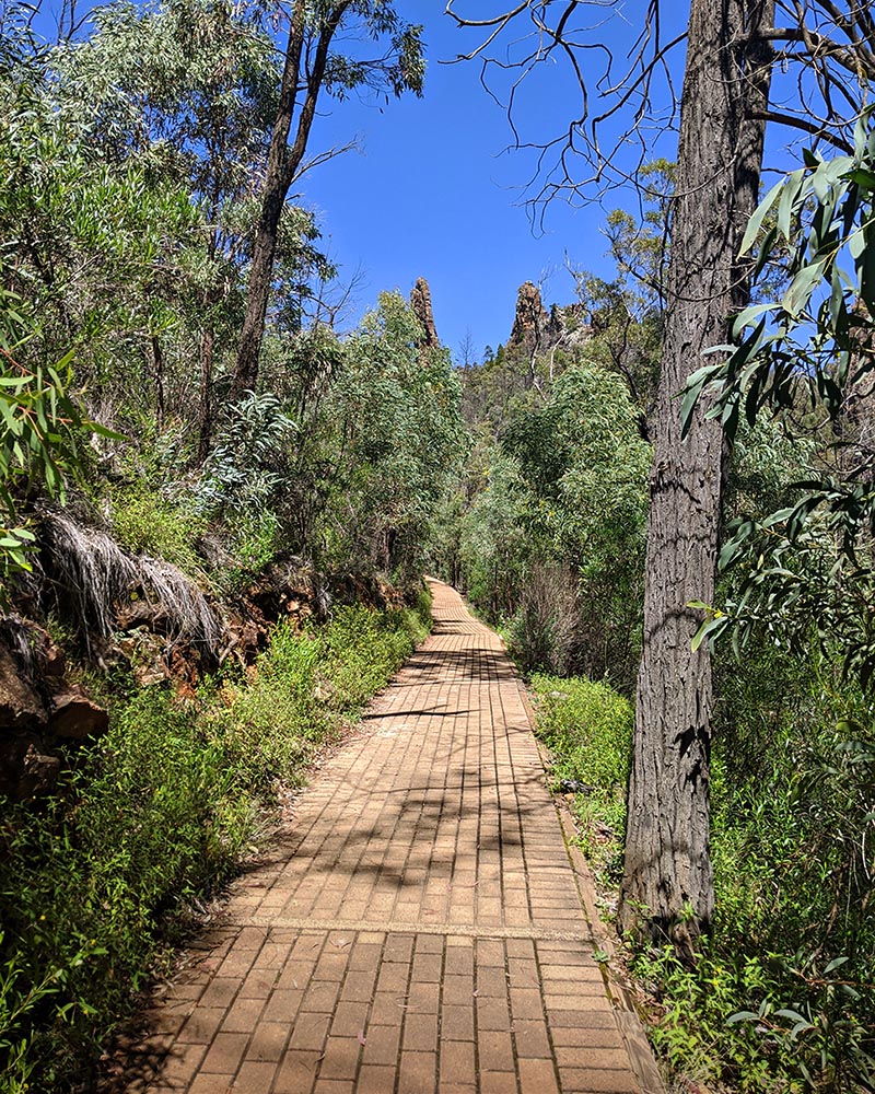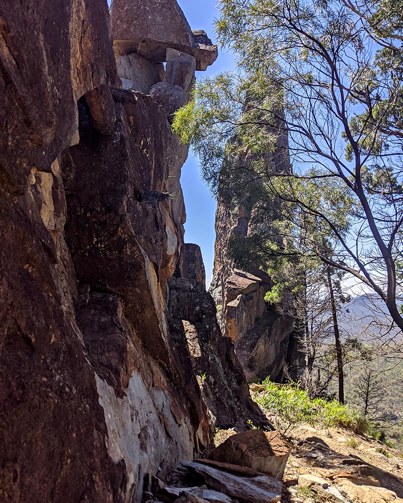 As you gain altitude, Belougery Spire begins to rear its head above the trees. Soon, staircases replace pavers and you realise you’re ascending straight up the guts of the grandest of high tops. Breadknife is on your right, Belougery Spire to the left. With each step up, another inch of them is revealed.