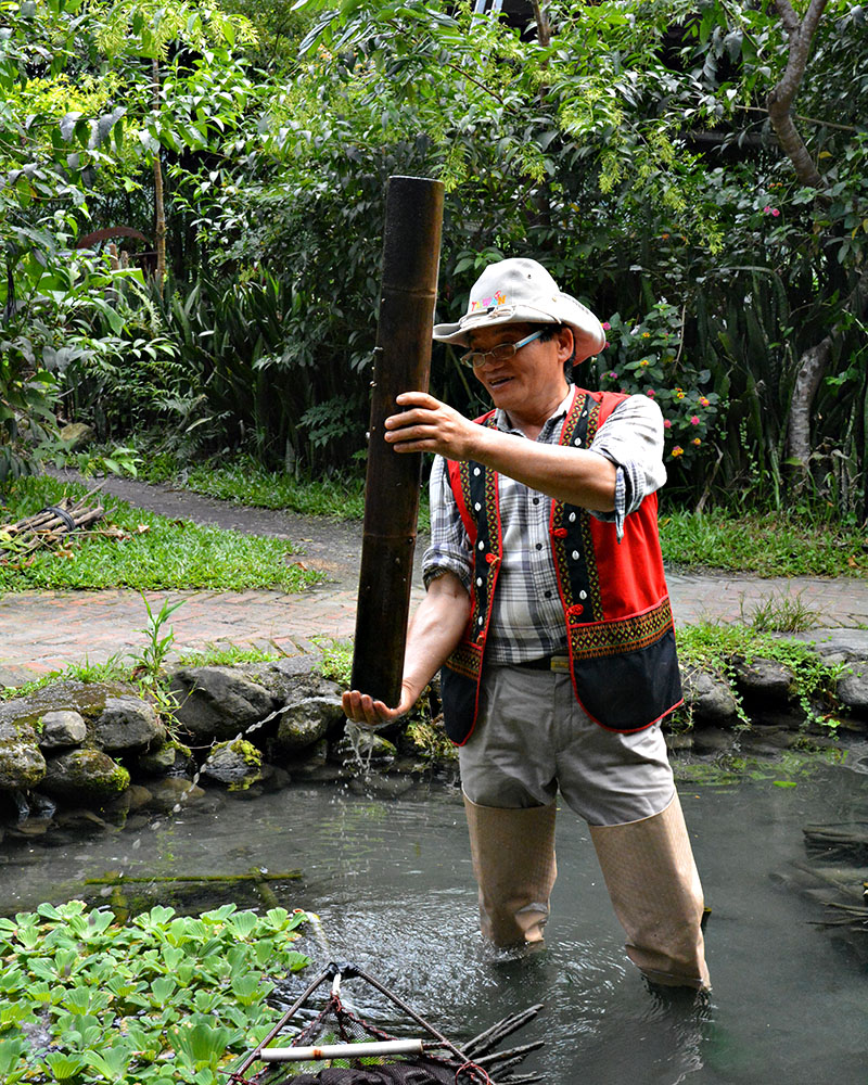 Unlike the familiar hook-and-line method, the Amis style sees us knee-deep in a river, checking bamboo tubes placed on the bottom. The villagers layer grass, sticks and bamboo in sections of the waterway, with each level designed to attract a different type of beast. “The marine life has no clothes so it likes to hide in the shade,” explains Lalan Unak, founder of the Fataan Pangcah Cultural Workshop, as we plug one end of the bamboo with a hand and pour water out of the other side hoping to find a nude eel or catfish hiding within. Shrimp and crabs dwell in the branches of the second level to avoid being eaten by the next: “The fish with clothes, with scales.”