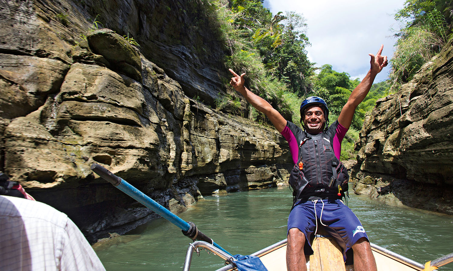 We are in a gorge about four metres wide with 50-metre-high black volcanic rock towering on either side. It could easily be the start of a Disneyland thrill ride themed on a cross between The Lord of the Rings and Deliverance. Waterfalls shower sporadically from the jungle above as the sun shines through the spray and mist. I stare up in awe. It is surreal and, much to Joe’s amusement, I almost fall in as we bounce off the rock face and into another rapid. “Paddle left!” Joe yells. “Harder, harder! Ok bula!” We all high-five with our oars.