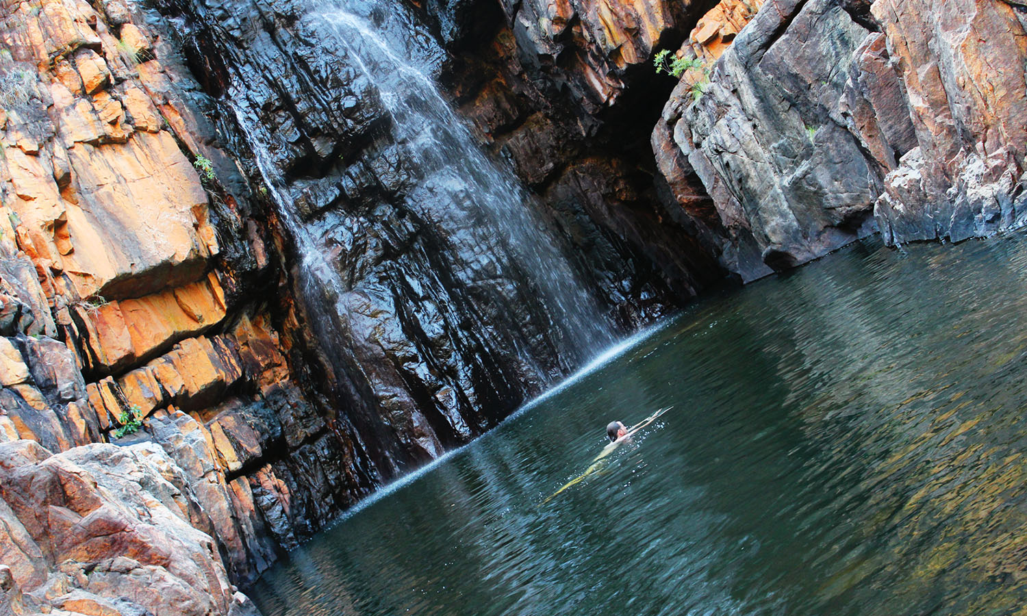 The air is fresh and wallabies are still nibbling on shoots. At 6.45am, the top rim of the red cliff blazes into light. Sun up! We hasten, loop over an escarpment, and scramble down a rocky path to the tranquil, waterfall-fed rockhole. Most tourists prefer the proximity of the campground swimming pool, meaning fish, frogs and turtles are our only company. It’s another glorious swim.