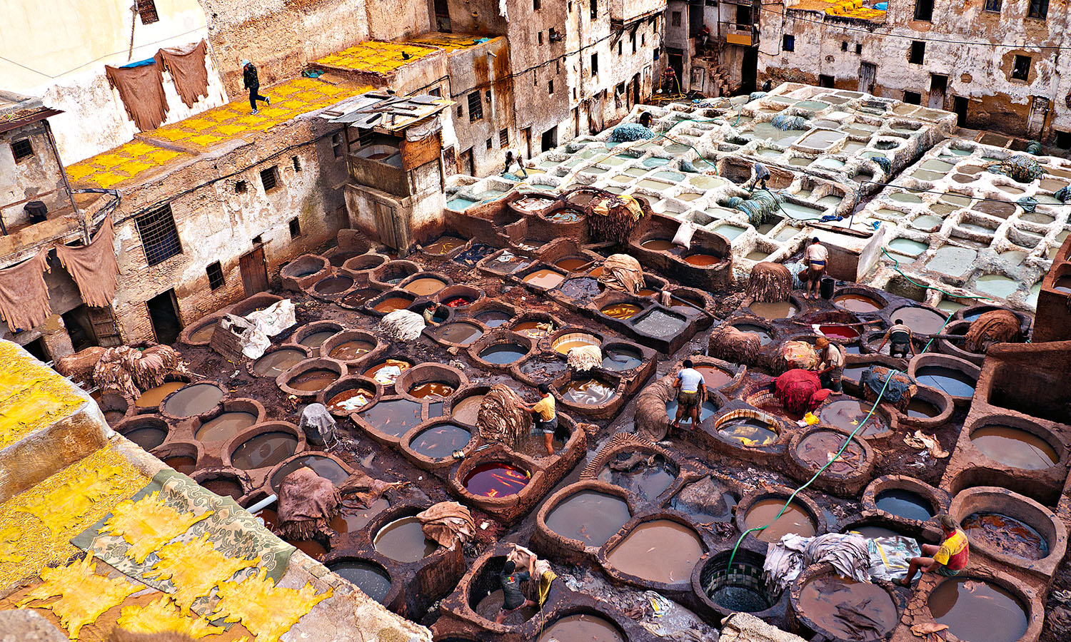 We visit the leather souks above the Fez River where, mint leaves pressed to our noses, Jess explains the centuries-old process taking place below us. Men in dye-stained shorts spend their lives washing, kneading and colouring fetid goat, camel, sheep and cow hides in huge open-air vats to transform them into Fez’s famed butter-soft leather, which is dyed with the likes of henna (orange), indigo (blue), cedar wood (brown), poppy (red) and saffron (yellow). And the secret to its suppleness: well, it’s the extra soaking in pigeon poo – whose ammonia acts as a softening agent – followed by kneading with bare feet.