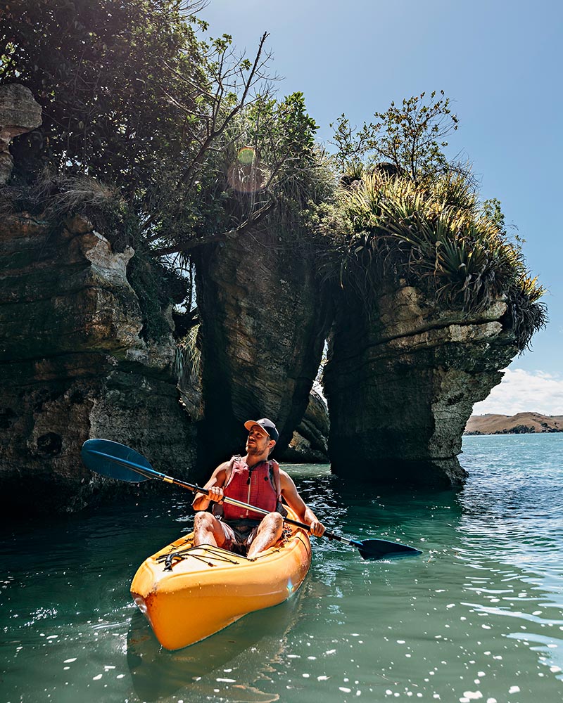 If you’re not feeling brave enough to do as the locals do and take the plunge, head to Raglan Backpackers and pick up a kayak for the day to explore the town’s highly underrated Pancake Rocks on the opposite side of the harbour. From there you can paddle your way to lunch down the stream to Rock-It Kitchen, a popular café in a renovated barn with designated spots for kayakers to come ashore.