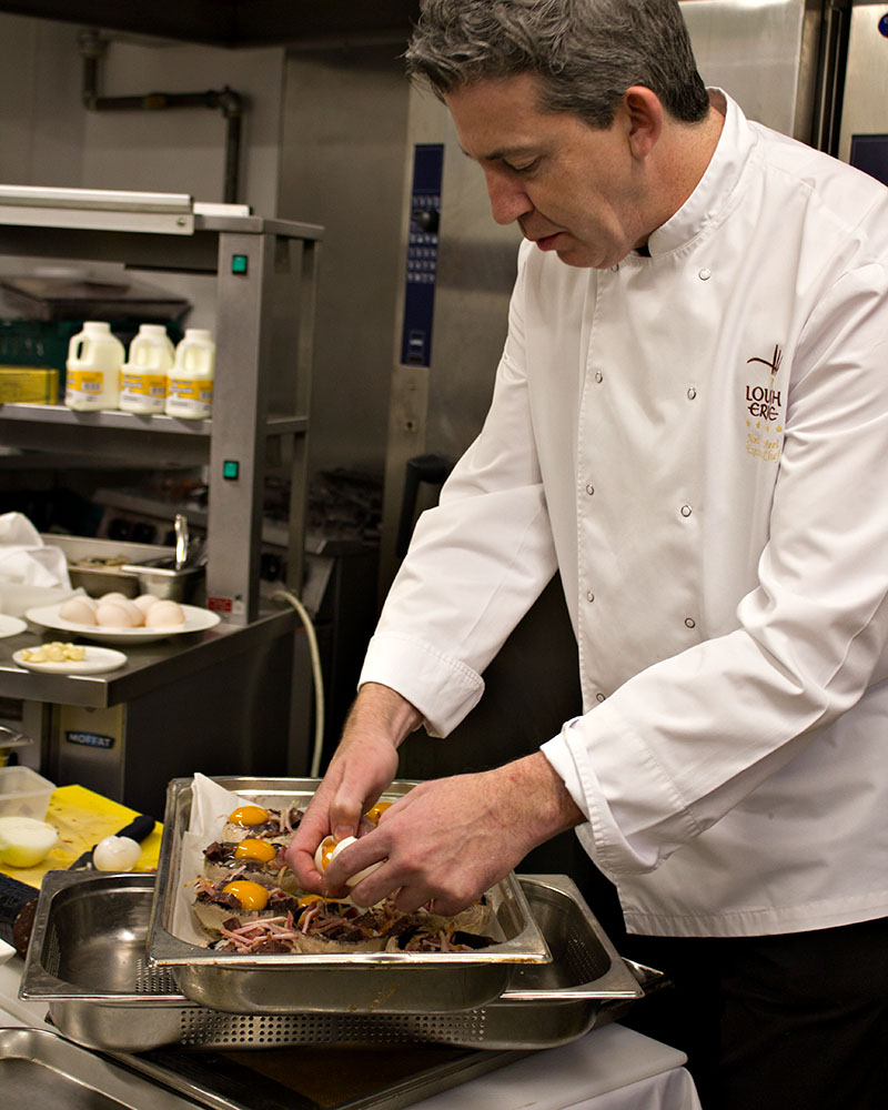 It’s invigorating to witness this simplicity in action as he spreads handfuls of shredded ham and black pudding on each mushroom, then cracks a duck egg in the centre, before haphazardly tossing cheese over the top.