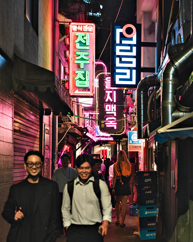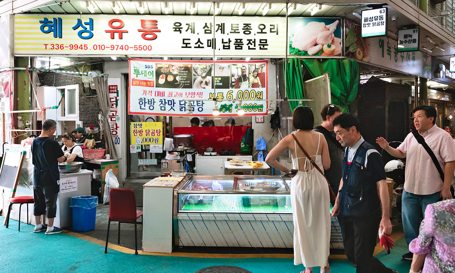 The restaurant is so discreet I would never have found it without the help of longtime expats and food experts, Ron and Joe. “I love the blend of the traditional and modern here at the market,” Ron says, adding more chilli to his bowl, “and I especially love all these little eating and drinking places.” Joe fills up my water glass and nods in agreement, “Millennials and Gen Z are really keeping Korean culture alive in places like this”.
