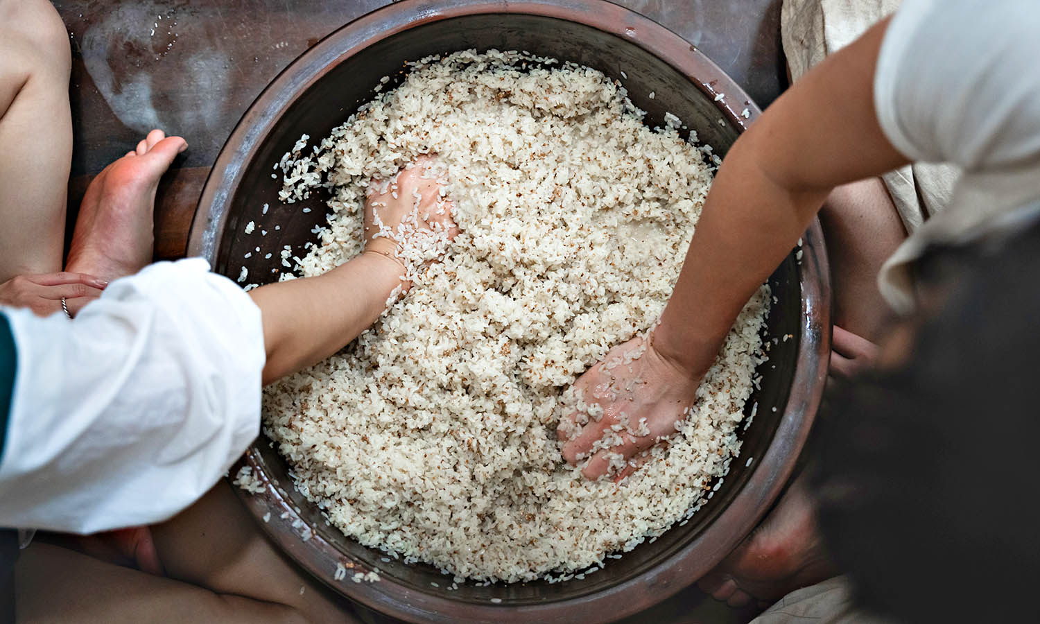 Later that afternoon, she lets me in on another wellness secret: 10mls of makgeolli rice wine a day will keep the doctor away. I’m actually elbows deep in yeast, rice and water, learning how to make makgeolli the traditional way when she tells me this. “Very nice,” she encourages, as I squash grains under my palm, “remember to put all of your good energy into it. Otherwise the batch might be bad.”