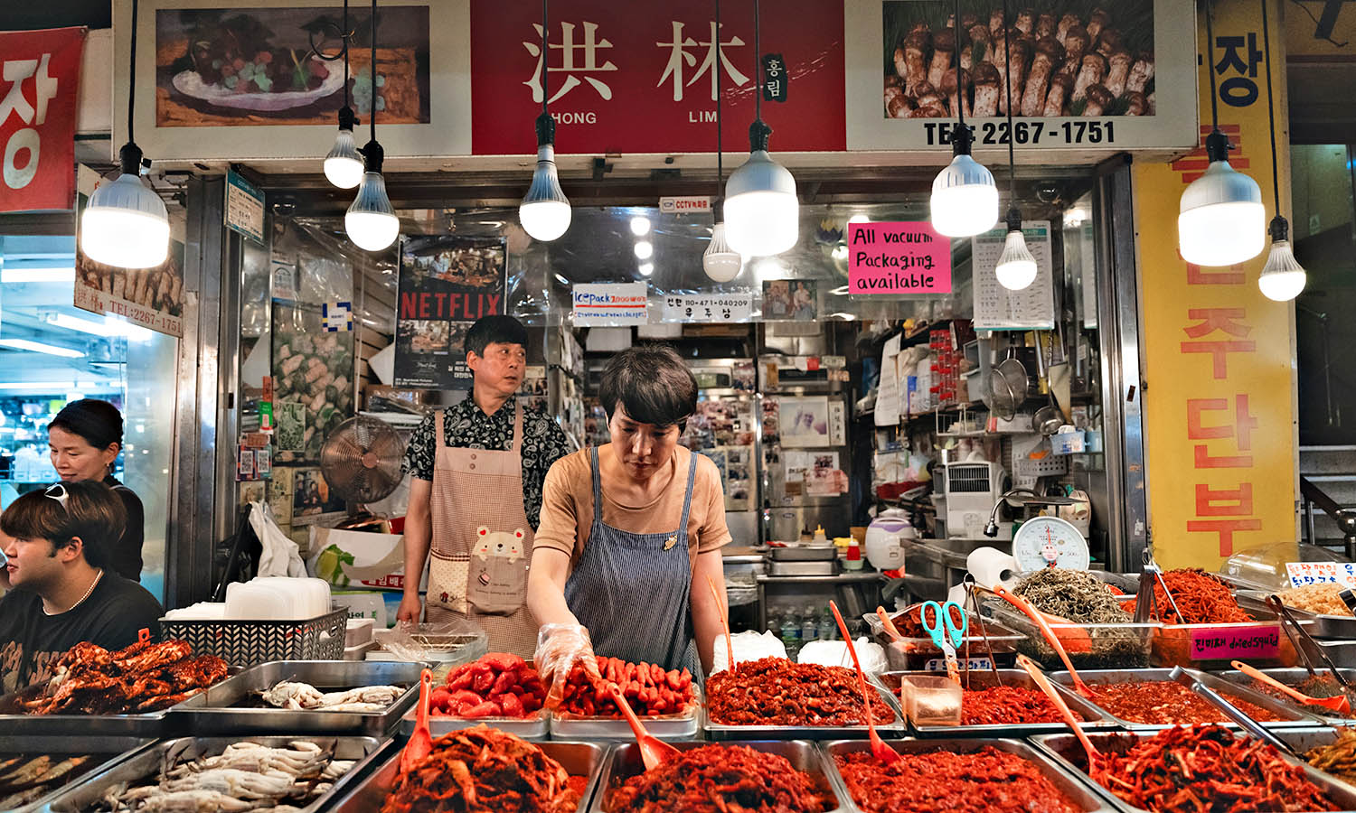 This is becoming somewhat of a recurring theme on this trip. Food culture here in South Korea is the ultimate example of tradition blending with modernity. In Seoul’s magical marketplaces you can find haejang-guk (hangover soup)—a local cure for too much soju—bubbling in pots beside stalls selling flame-torched marshmallow ice cream.