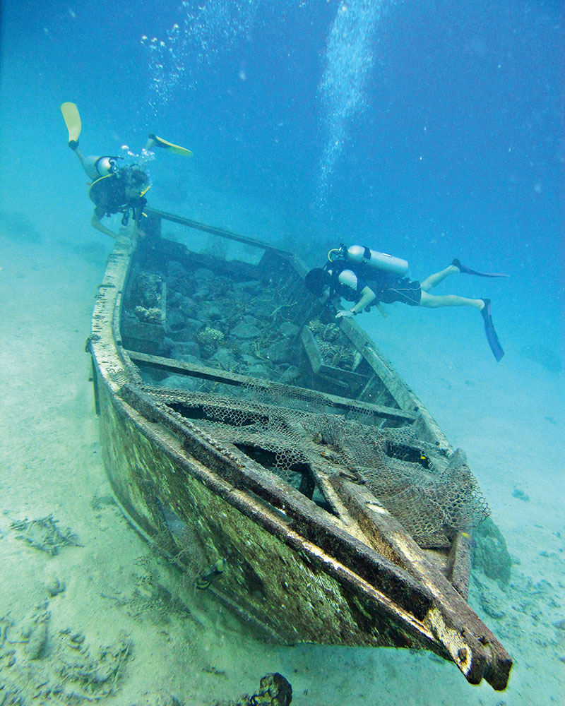 When the job is done, I have plenty of gas left to go and explore. As I drop another eight metres, a sunken boat suddenly looms into view. Unusually for a wreck, this one’s story has a happy ending. It’s known as the Wobbegong and inside it are the program’s success stories: mature clams, all busily chomping on starfish eggs.