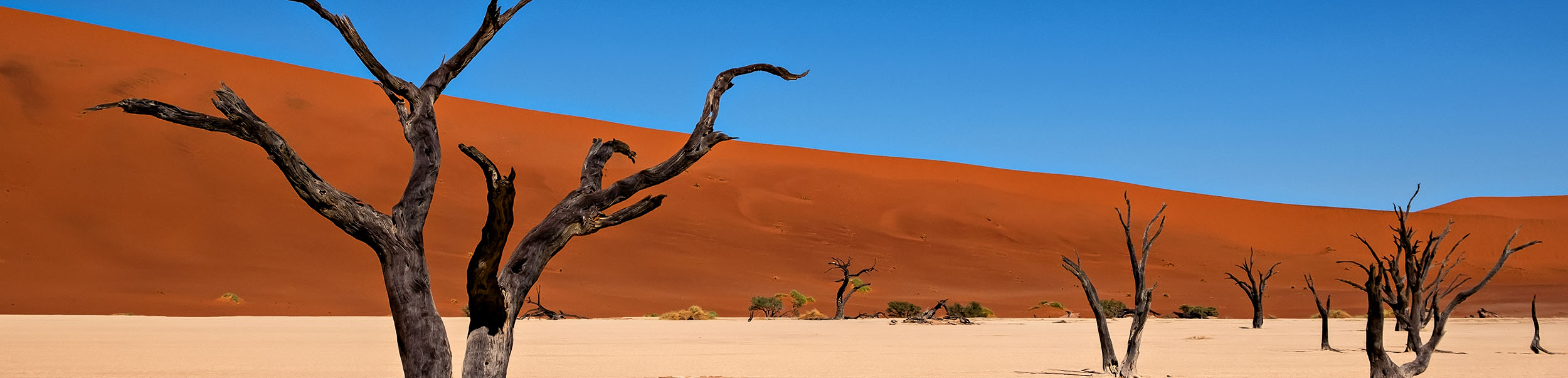 The area’s drawcard is Deadvlei, a lake bed of stark white clay dotted with fossilised 900-year-old camel thorn trees. Big Daddy looms over it, so we decide to take the shortcut in. My guide Richard and I giggle at each other’s slow-motion astronaut walk down the steep bowl of the dune. Our steps create lava-like momentum, pushing us down effortlessly. With its sticky combo of sand and sunscreen, my skin resembles a sugared donut. The dark forest sculptures are striking against the saturated hues of the red dunes, vivid blue sky and crackled white ground.