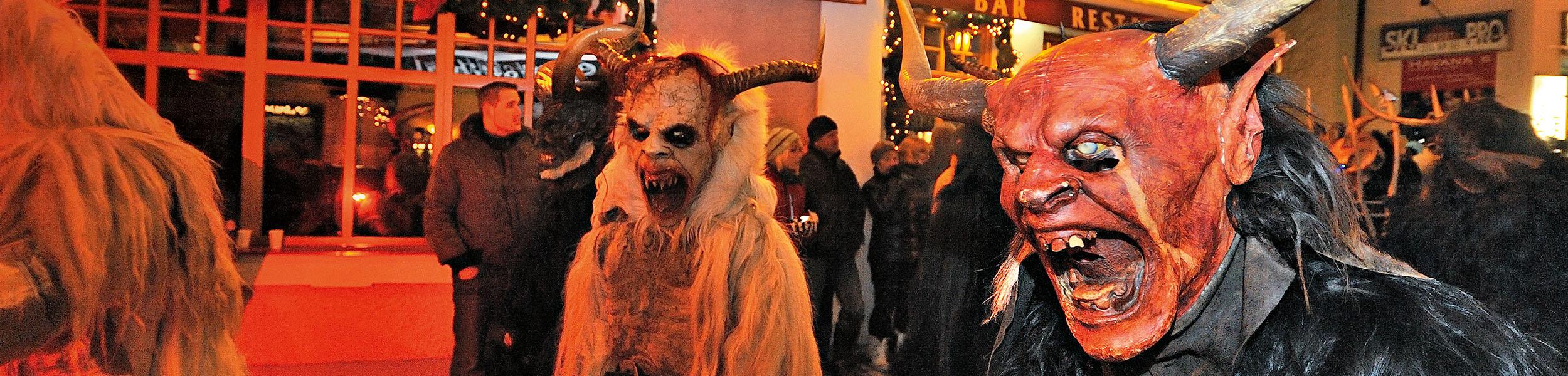 Strings of fairy lights illuminate the quaint buildings, festooned with Christmas decorations. Families and friends chat and laugh, digging gloved hands deep into coat pockets to stay warm. It’s a cheery scene until silence suddenly sweeps over the crowd as the white snow at the top of the hill darkens and scores of terrifying-looking, fur-covered horned beasts brandishing whips and chains appear and descend en masse toward us. Fear replaces the smiles on the children’s faces.