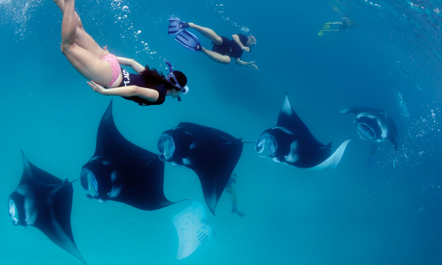 There is some debate over the collective noun for manta rays, also known as devilfish – they’re either a squadron or a fever – but whatever you call them, nothing quite prepares you for the moment ten horn-shaped cephalic fins glide out of the dark blue ocean in almost perfect formation, with gaping mouths wide enough to swallow a small child. The visibility isn’t great for this first sighting; the plankton has clouded the normally gin-clear waters, but it’s a small price to pay to be surrounded by so many mantas at once.