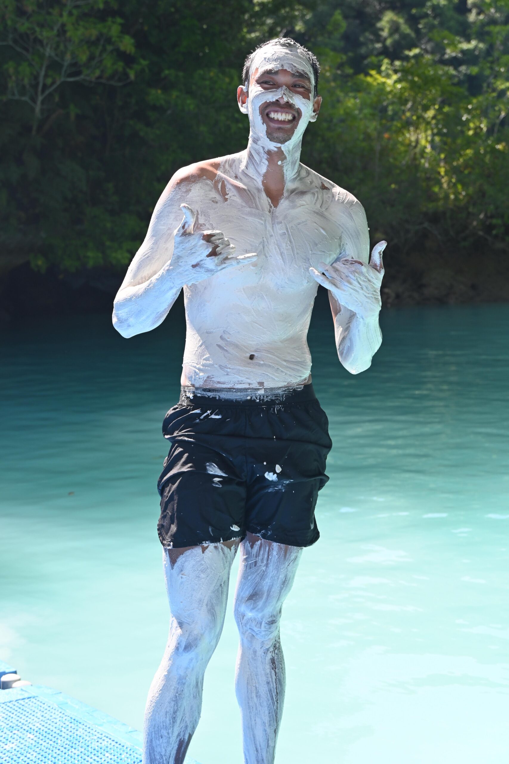 Literally stinks. He’s diving deep into the turquoise waters of The Milky Way, a lagoon nestled in Babeldaob Island, Palau, and bringing up smelly mud from the bottom to pile high on a boogie board.