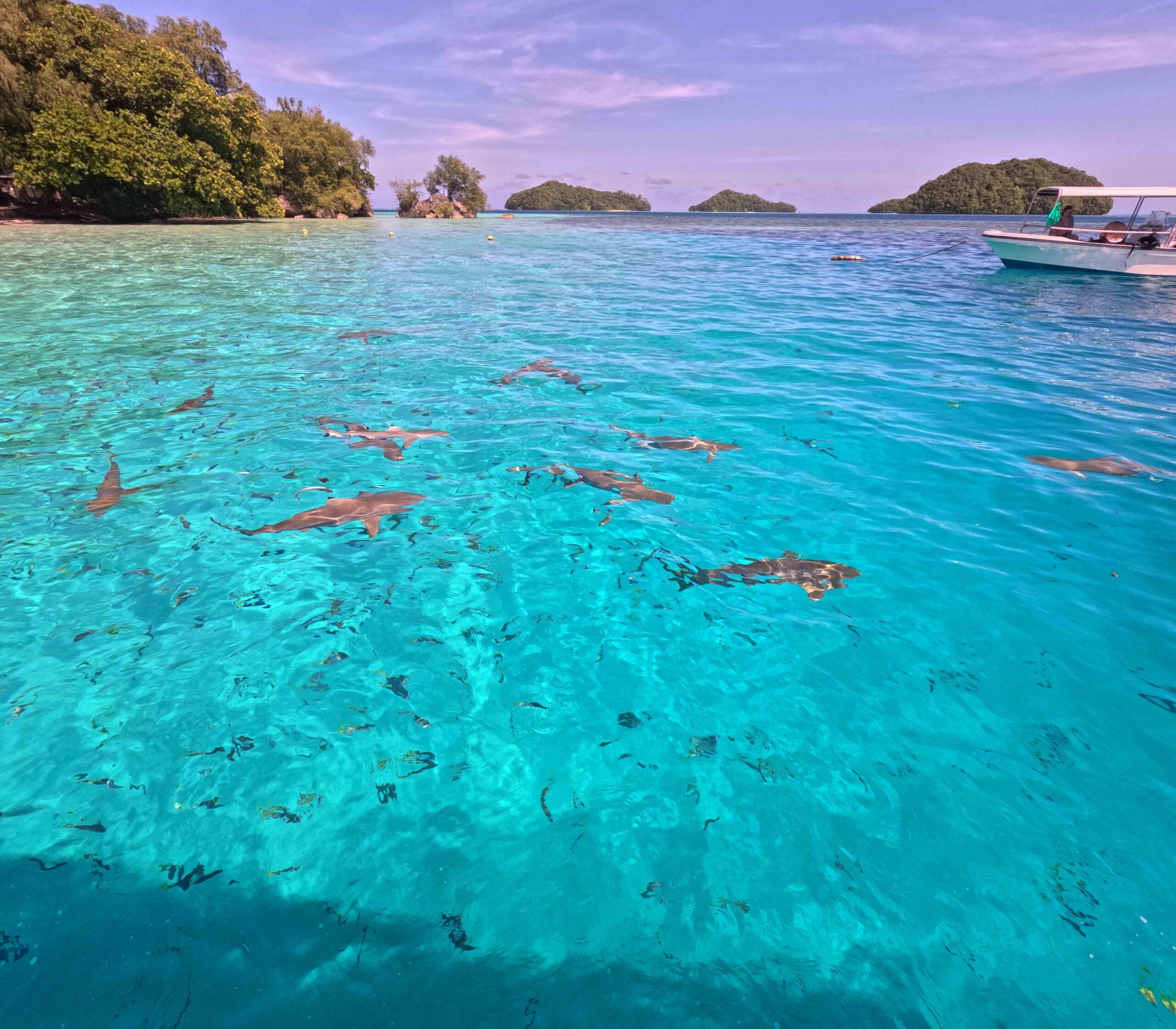 Knowing reef sharks don’t usually eat people is one thing, believing it is another, but I’m amazed to discover I’m completely at ease. Wonder is the main emotion. They are incredible. Close enough to touch, the sharks weave their way around our party with two small thin fish, who take care of shark hygiene issues, clinging to their sides. It’s an amusing sight as they follow an invisible track through the water, as if they are on their own Tour de Palau with the sharks taking the lead as their domestique.
