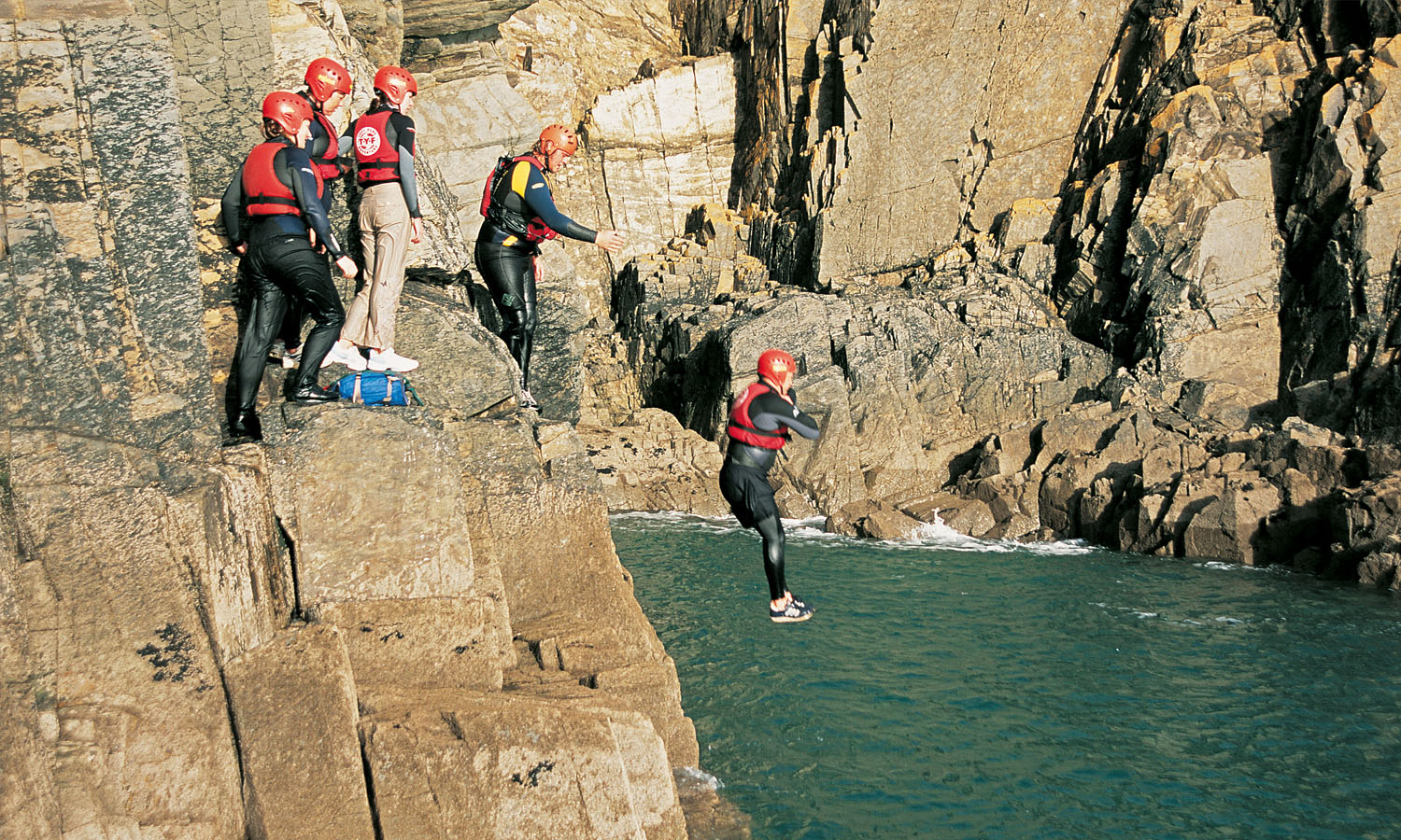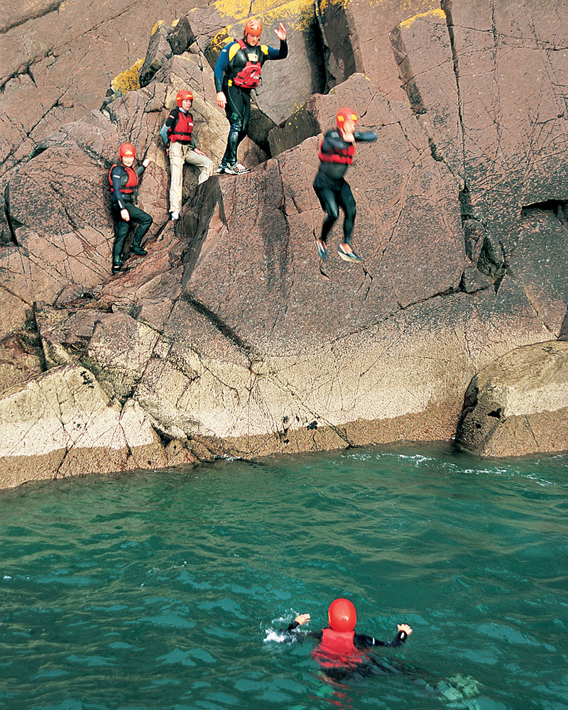 There are no longer taxmen to avoid, but like the smugglers before us, our small gang of intrepid coasteerers is clambering over rocks, squeezing through watery passages and willingly diving into jellyfish-infested seas. Chris, our instructor, is next up onto the ledge and, after guiding more than 200 coasteering groups along these cliffs, a simple feet-first jump is no longer a big enough thrill for him. Instead, he performs a showy back flip off the rock, gracefully entering the water with barely a ripple. The rest of the group takes turns to plunge into the waves. Once everyone has received a decent dunking we swim on, seeking out the next test of our nerves.